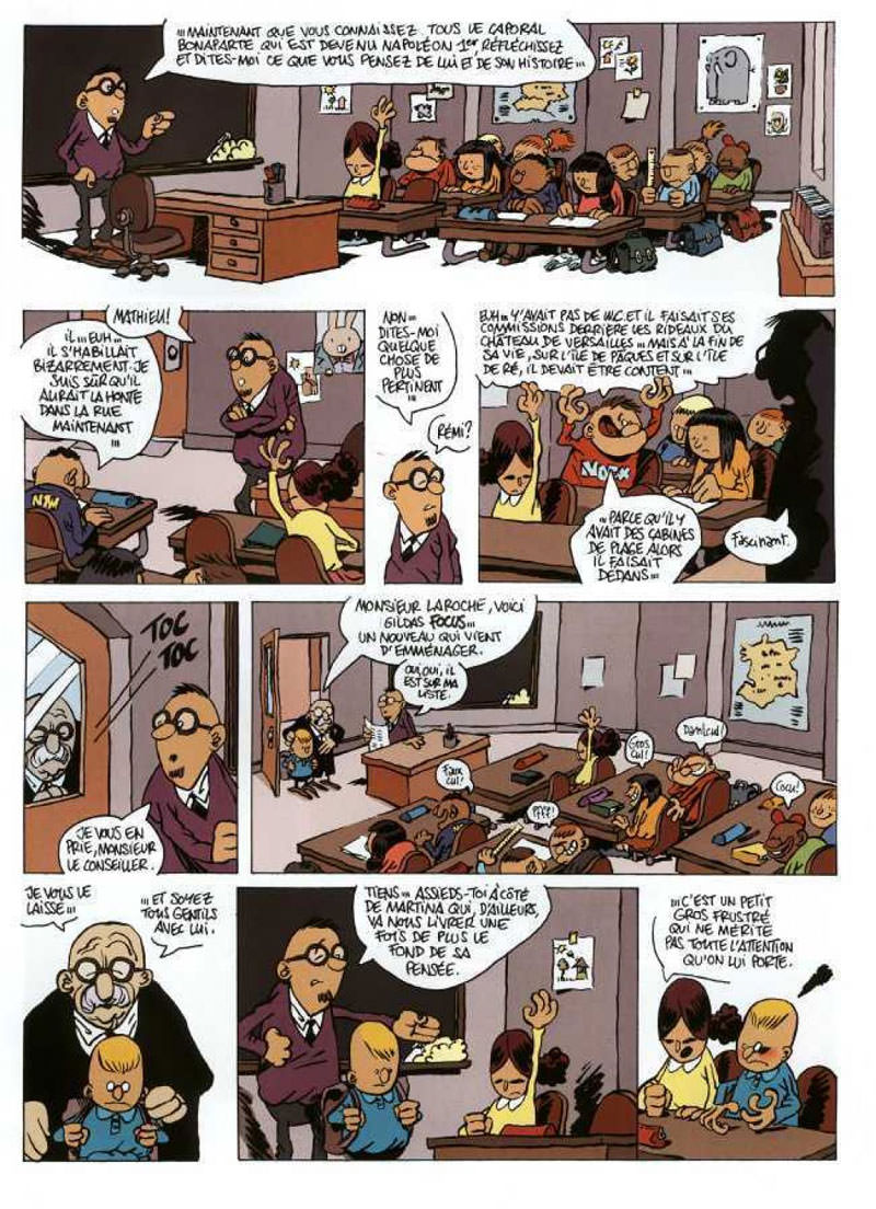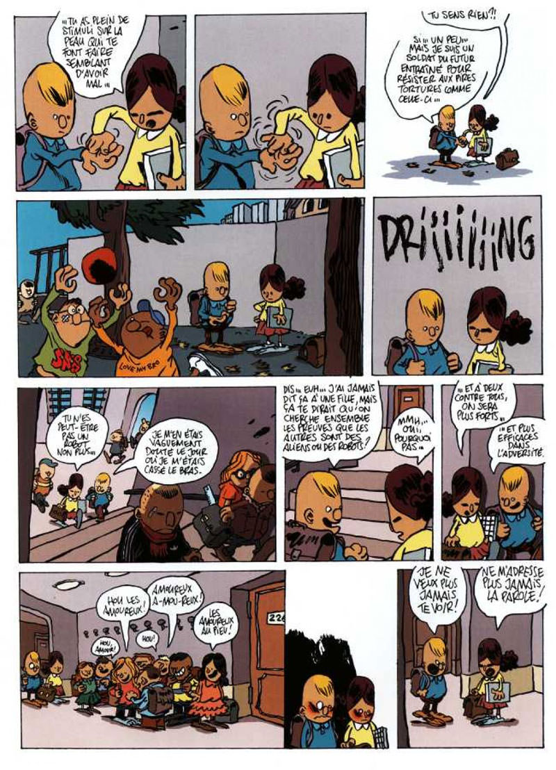 Ce récit est un récit férocement piégé. Il démarre dans une cour de récréation, puis dans une salle de classe, ou la caméra graphique virtuose de Larcenet immobilise tres vite deux gamins d’une dizaine d’années : Gildas et Martina. Tout aussi. Gildas (dont le cri de guerre est : "Cosmonaute du futur !") et Marina paraissent simplement un peu intoxiqués par la S.F., le fantastique. Ils voient des robots, des Aliens partout
