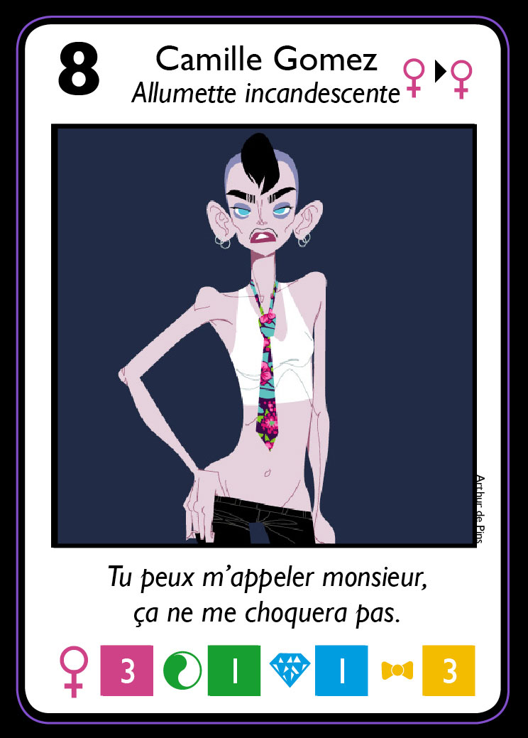 Parce qu’il en faut pour tous les goûts, voilà le coup d’un soir pour tous ! Gay, lesbiens, transsexuels, LGBTQ de tous pays, donnons nous la main et commençons une grande farandole qui...Bref, Le jeu où il faut pécho se décline désormais dans tous les genres, y compris la théorie du genre (qu’on n’a pas très bien comprise). La carte COMING OUT fait son apparition, ainsi que la carte PETITE OPERATION, mais aussi des coups de putes inédits, telles que la FRIENDZONE, ou des arguments émouvants comme le FAUTEUIL ROULANT. Le boitier est signé par Arthur de Pins, qui est accompagné pour, le reste des illustrations par une clique de gens talentueux : Geoffroy Monde, POCHEP, Monsieur Le Chien, mais aussi Erwann Surcouf, Franz-Alexandre Torreele, Marjorie Monnet, Bastien Vivès ou Guillaume Martinez.