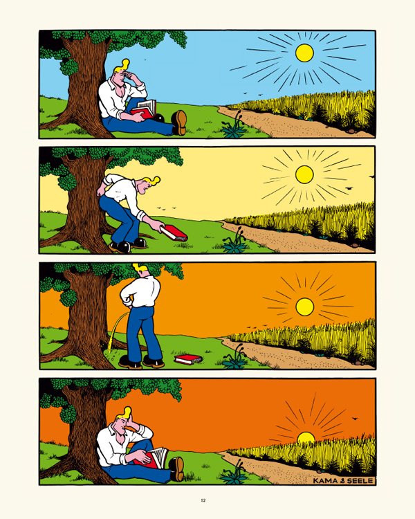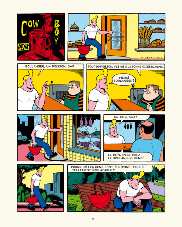 « Cowboy Henk, ce n’est pas toujours bien, mais quand c’est bien, c’est VRAIMENT bien. » Umberto Eco. Avec sa houppette blonde, Cowboy Henk pourrait être le pendant surréaliste de Tintin. Politiquement incorrect, parfois potache mais tendre aussi, Cowboy Henk est un héros vieux de 30 ans, véritable icône pop et absurde ! Figure incontournable de la culture flamande, il est apparu chaque semaine de 1981 à 2012 dans l’hebdomadaire flamand à gros tirage Humo. Et quand il traverse la frontière, Cowboy Henk est publié dans la cultissime revue RAW d’Art Spiegelman, avant de faire des apparitions en France dans Fluide Glacial, Psikopat ou Hara Kiri dans les années 80 et 90. Amateur du nonsense, et héritier direct du surréalisme belge, Cowboy Henk contient autant de références à la bande dessinée américaine classique qu’au dadaïsme. Herr Seele avoue pratiquer un humour vache comme Magritte et sa peinture vache : peinte avec la queue d’une vache.