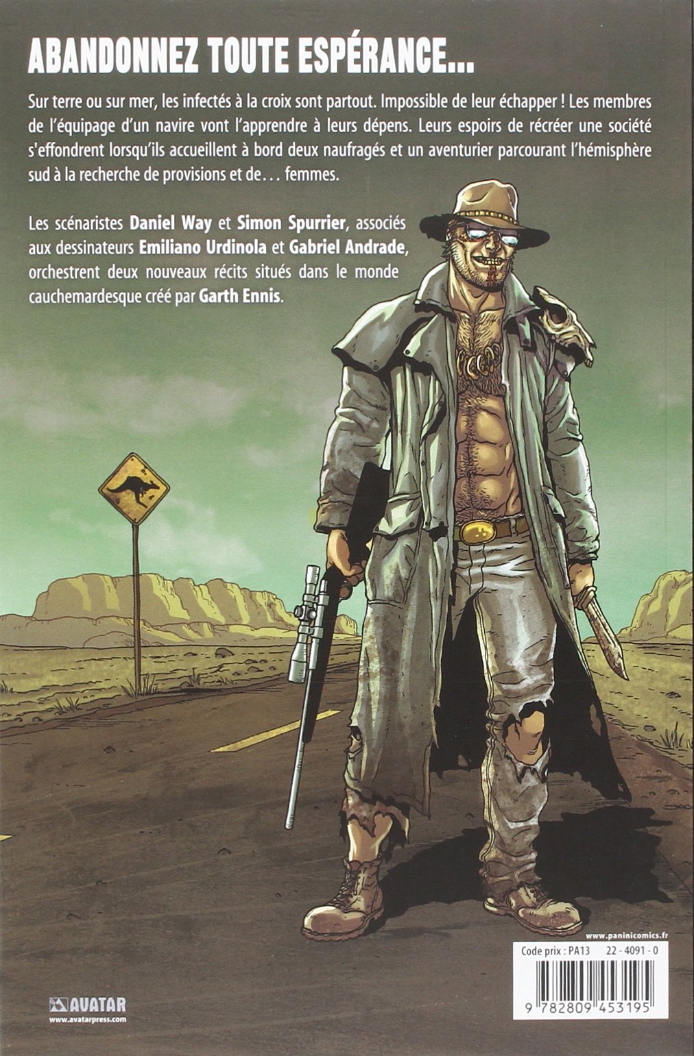 Deux histoires et deux scénaristes pour une quantité de nouvelles plaies dans un monde en proie aux infectés ! Daniel Way (Deadpool) nous présente un capitaine de navire et son équipage qui tentent de survivre à la furieuse épidémie se répandant sur tout le globe. Simon Spurrier (X-Force) s’intéresse pour sa part à l’outback australien, où un ancien marginal est désormais Empereur du désert. Mais son désir d’avoir à sa disposition un harem qui le vénère va l’exposer aux pires horreurs du monde des Infectés.