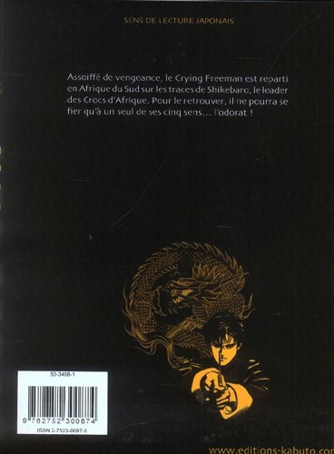 Assoiffé de vengeance, le Crying Freeman est reparti en Afrique du Sud sur les traces de Shikebaro, le leader des Crocs d’Afrique. Pour le retrouver, il ne pourra se fier qu’à un seul de ses cinq sens, l’odorat !