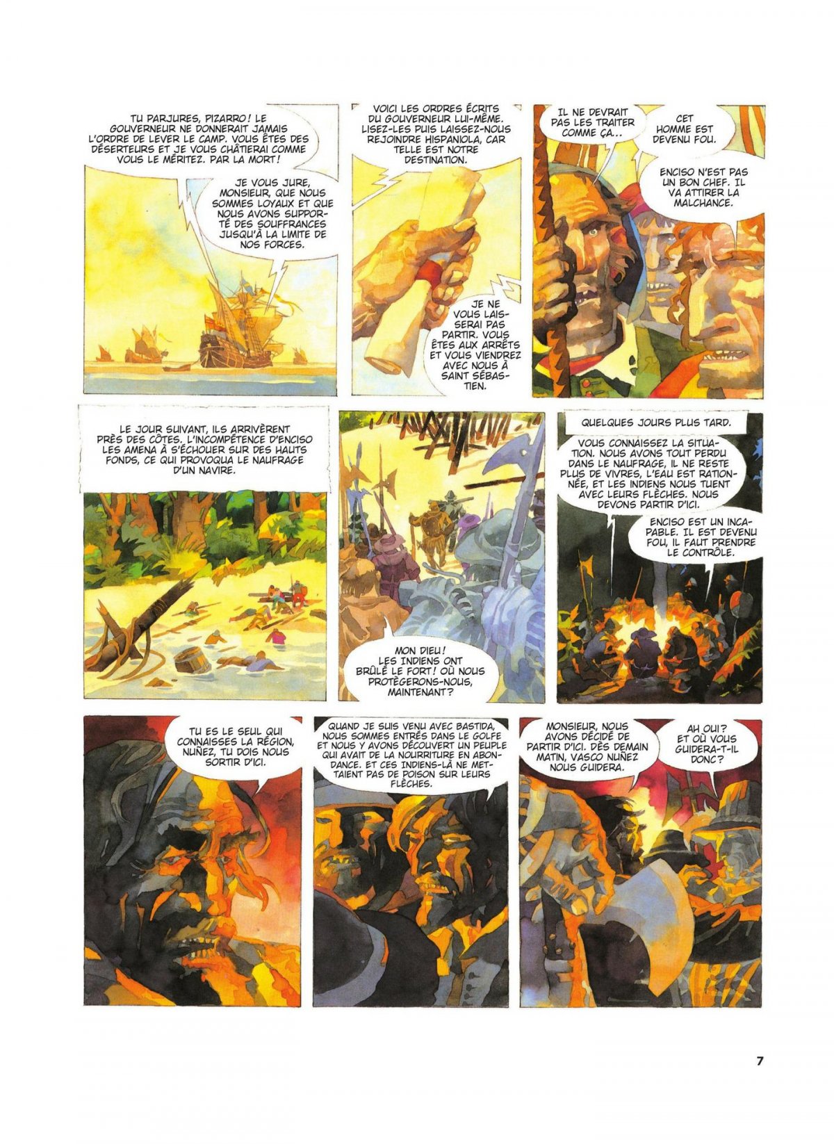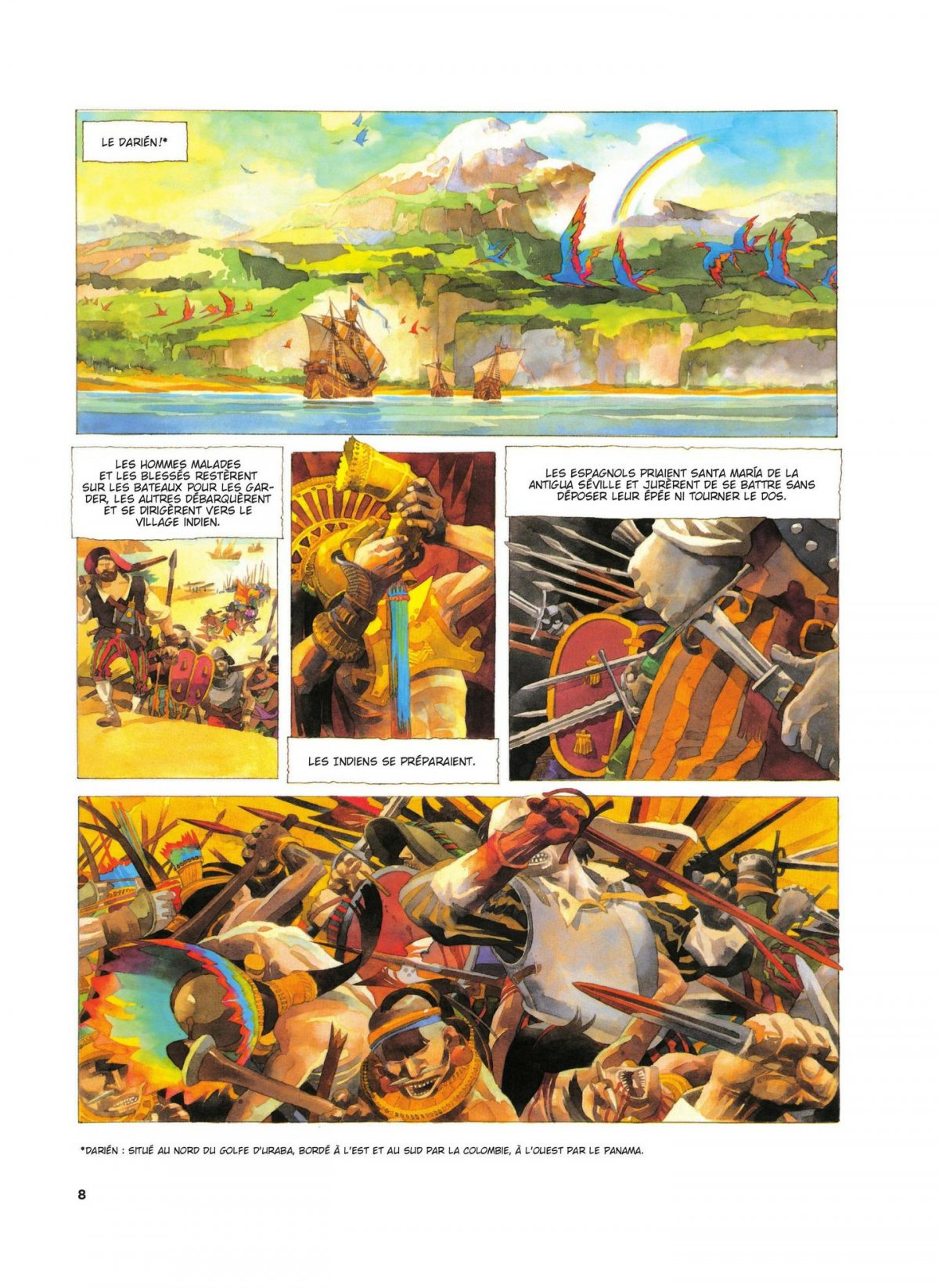 Le 1er septembre 1513, le conquistador espagnol Vasco Nunez de Balboa devenait le premier européen à regarder l’Océan Pacifique. Parti de la ville de Santa María qu’il avait fondée deux ans plus tôt, il traversa l’isthme de Panama avec 190 soldats espagnols et un millier d’indiens pour finalement arriver sur la rive du Pacifique. Cette bande dessinée historique très bien documentée raconte les péripéties de cette traversée ô combien semée d’embûches, les tentatives de trahison, les affrontements avec les peuples autochtones et la découverte finale d’un Océan encore inconnu des Européens. Enrique Breccia sublime ce récit historique fort et prenant par son dessin en couleurs directes. Ce livre, initialement édité en Espagne pour commémorer les 500 ans de la découverte de l’Amérique, permet de découvrir une autre facette de l’immense talent d’Enrique Breccia.