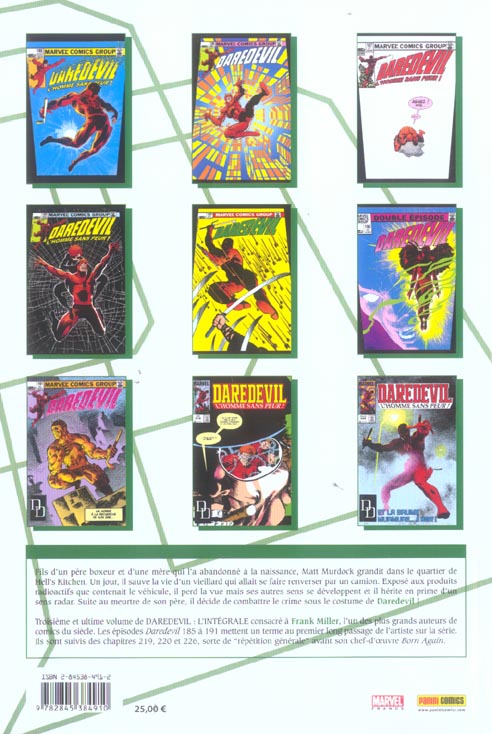 Après le bouleversant récit de la mort d’Elektra, il ne restait à Miller qu’à conclure sa longue prestation sur la série par un autre coup de théâtre tout aussi renversant. On retrouve la rutila grecque dans la série de l’homme sans peur, d’abord dans trois épisodes indépendants, puis dans le chef-d’oeuvre Renaissance. Retrouvez dans ce troisième volume de Daredevil : l’intégrale les derniers chapitres du premier long passage de Miller sur la série (des numéros 185 à 191), deux épisodes parus quelques mois plus tard dont il cosigne l’intrigue, et un autre consacré à Matt Murdock, mis en images par John Buscema.