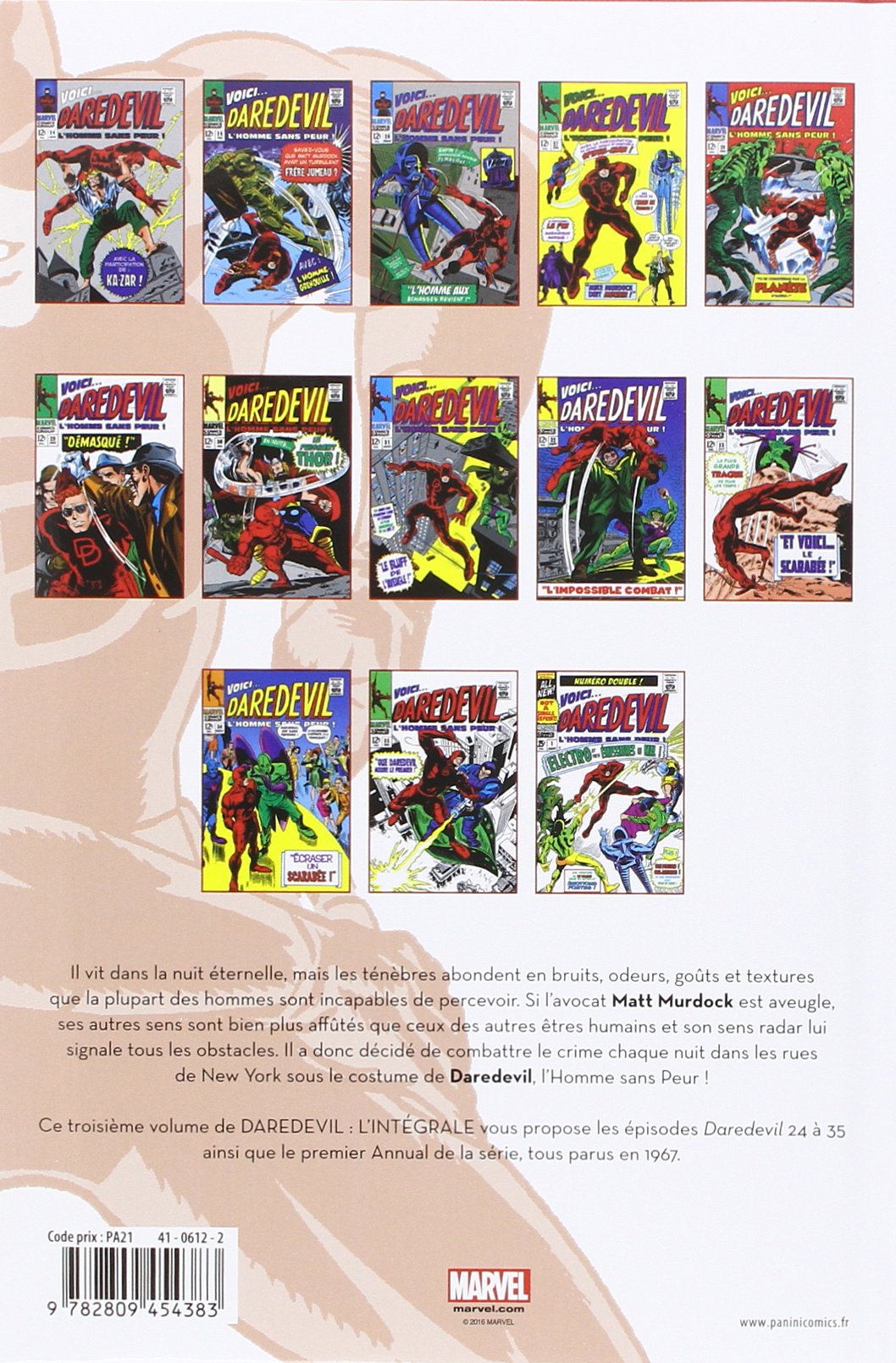 Daredevil Intégrale 1967 est le volume 3 de la série Daredevil Intégrale par Stan Lee, John Tartaglione, Frank Giacoia, Dick Ayers, Gene Colan et John Romita, Sr., paru en 2016. Selon nos informations, il n'en existe qu'une seule édition, publiée par Panini Comics.