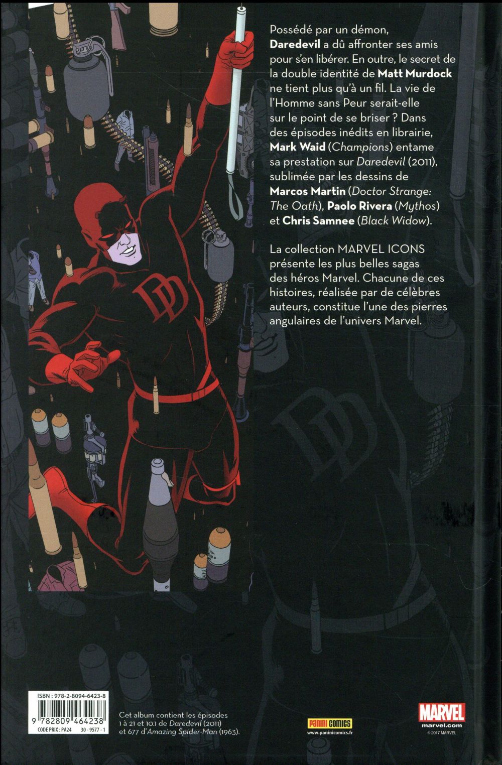 Possédé par un démon, Daredevil a dû affronter ses amis pour s’en libérer. En outre, le secret de la double identité de Matt Murdock ne tient plus qu’à un fil. La vie de l’Homme sans Peur serait-elle sur le point de se briser ? Dans des épisodes inédits en librairie, Mark Waid (Champions) entame sa prestation sur Daredevil (2011), sublimée par les dessins de Marcos Martin (Doctor Strange : The Oath), Paolo Rivera (Mythos) et Chris Samnee (Black Widow).