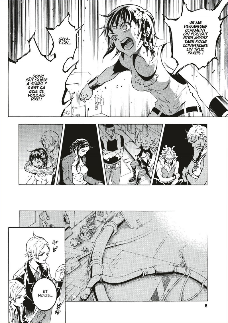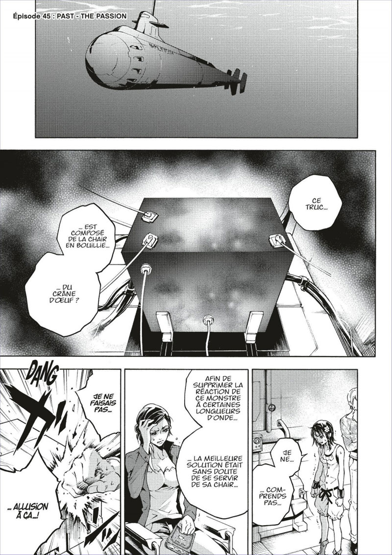 Ganta et Senji se dirigent vers les tréfonds de Deadman Wonderland à la recherche des « chorus blocks » qui constituent la clé de l’énigme du crâne d’oeuf. Mais Toto Sakigami apparaît devant eux. Ganta protège Senji, et se fait capturer... De son côté, Makina a mis la main sur le journal de Sorae, la mère de Ganta. Des faits stupéfiants concernant le passé de Shiro et de Ganta y sont relatés...