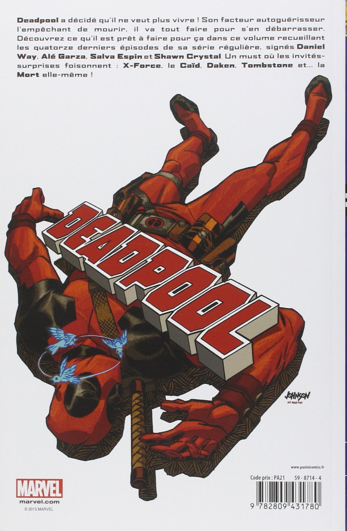 Deadpool est certainement l’un des héros les plus ambigus de l’univers Marvel. Il est le protagoniste d’aventures résolument déjantées, placées sous le signe d’un humour délirant. Pourtant le mercenaire disert n’a qu’une ambition : Mourir afin de retrouver enfin la Mort dont il est amoureux fou. Mais sa dernière tentative pourrait avoir des effets imprévus. Avec Wolverine, X-Force, le retour de la terrible Intelligentsia, et une apparition du Maître de Corvée