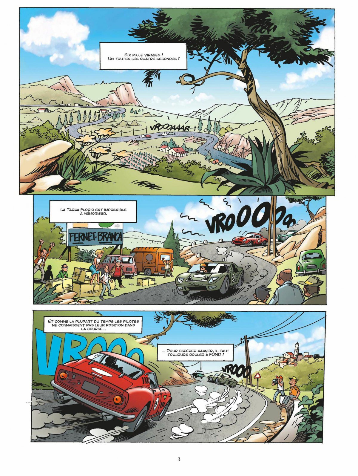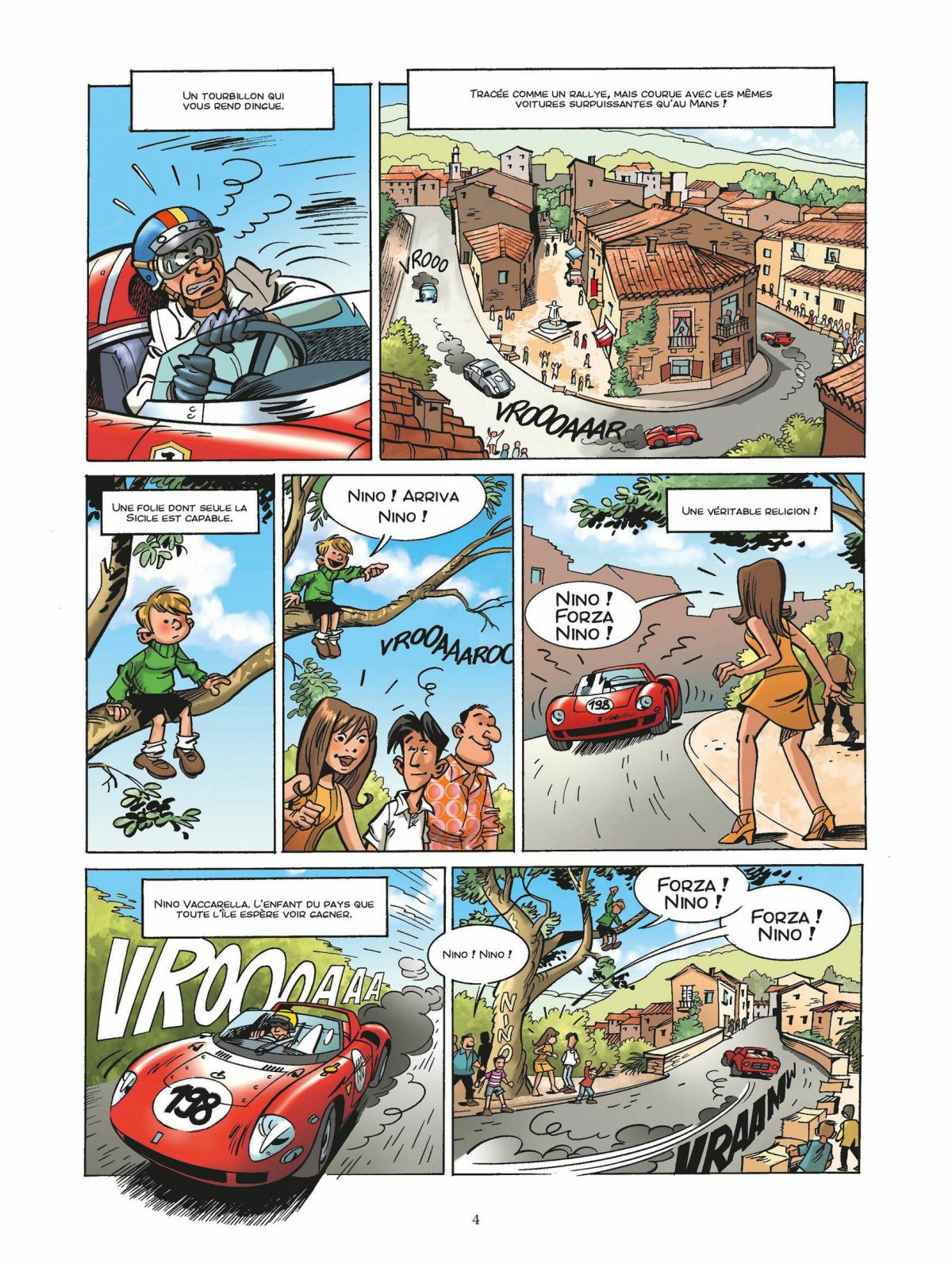 1965. Angelo, un bel adolescent, regarde la Targa Florio avec sa petite amie Rosalia. Cette course, qui fait le tour des routes de la Sicile, est un exemple unique de folie et de liberté. Alors que la joie inonde les rues de l’île suite à la victoire de Nino Vaccarella, l’enfant du pays, les deux amants scellent un pacte. Ils se marieront uniquement si Angelo réussit à remporter la Targa Florio avant ses 25 ans. 8 ans plus tard, il participe à l’édition de 1973 avec son Alpine. Mais les amateurs de la course ne sont pas dupes : la Targa vit ses dernières heures, mesures de sécurité obligent. C’est probablement la dernière chance pour Angelo de remporter la course, s’il veut pouvoir épouser la belle Rosalia...À travers une touchante romance placée sous le signe de l’automobile, Dugomier nous fait découvrir la mythique Targa Florio ! Le dessin rond, vif et enlevé de Jean-Marc Krings, dans l’esprit des sixties et de l’école Marcinelle, nous plonge dans l’ambiance unique de cette époque, légère et insouciante.