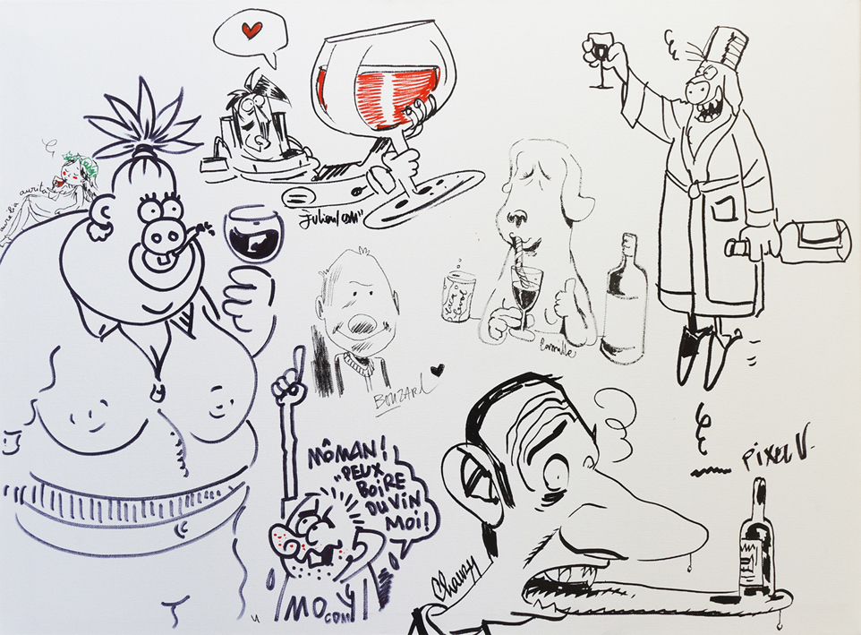 C’est à la Cave du Domaine des Valois le 1er février dernier, au cours d’une soirée dédiée au bon goût, que les auteurs de la revue Fluide Glacial se sont livrés au jeu du dessin en direct. Guillaume Bouzard, Mo/CDM, Jean-Christophe Chauzy, Coyote, Mikl, Romain Dutreix, Pixel Vengeur, Lefred-Thouron, Libon, Aurélia Aurita, Camille et Yann Lindingre ont ainsi réalisé une toile commune (voir ci-dessous) devant une assemblée de 250 invités.