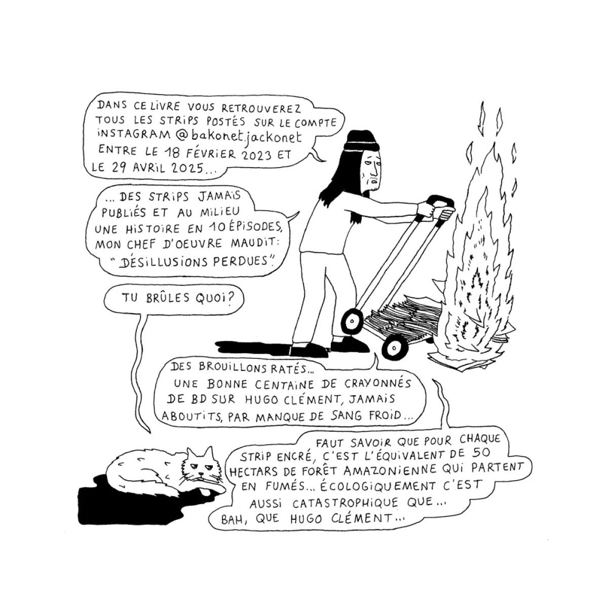 Désillusions perdues est une compilation des strips postés par Bakonet sur instagram, au gré d’une actualité toujours plus déprimante, tentant de tourner en dérision un monde déjà si déraisonnable. Toutes ces petites histoires qui ont forgé son univers acerbe, de l’anecdote de Merdella à Tolbiac, à Titeub à Angoulême, ou encore les aventures de Cocoplantu.