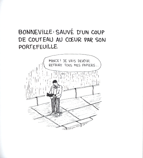 Conscients de toute cette richesse, les gens du site www.faitsdivers.org se sont mobilisés pour les recenser, classifier, archiver car, cerise sur le gâteau, les faits divers sont également monnaie courante. On imagine alors Matthieu Chiara devant son écran d’ordinateur, armé d’un crayon, d’abord sonné devant l’incongruité de tel homicide, puis, convaincu qu’il vaut mieux en rire, griffonnant un dessin, cherchant la blague ou le jeu de mot, prenant le contre-pieds d’une illustration attendue