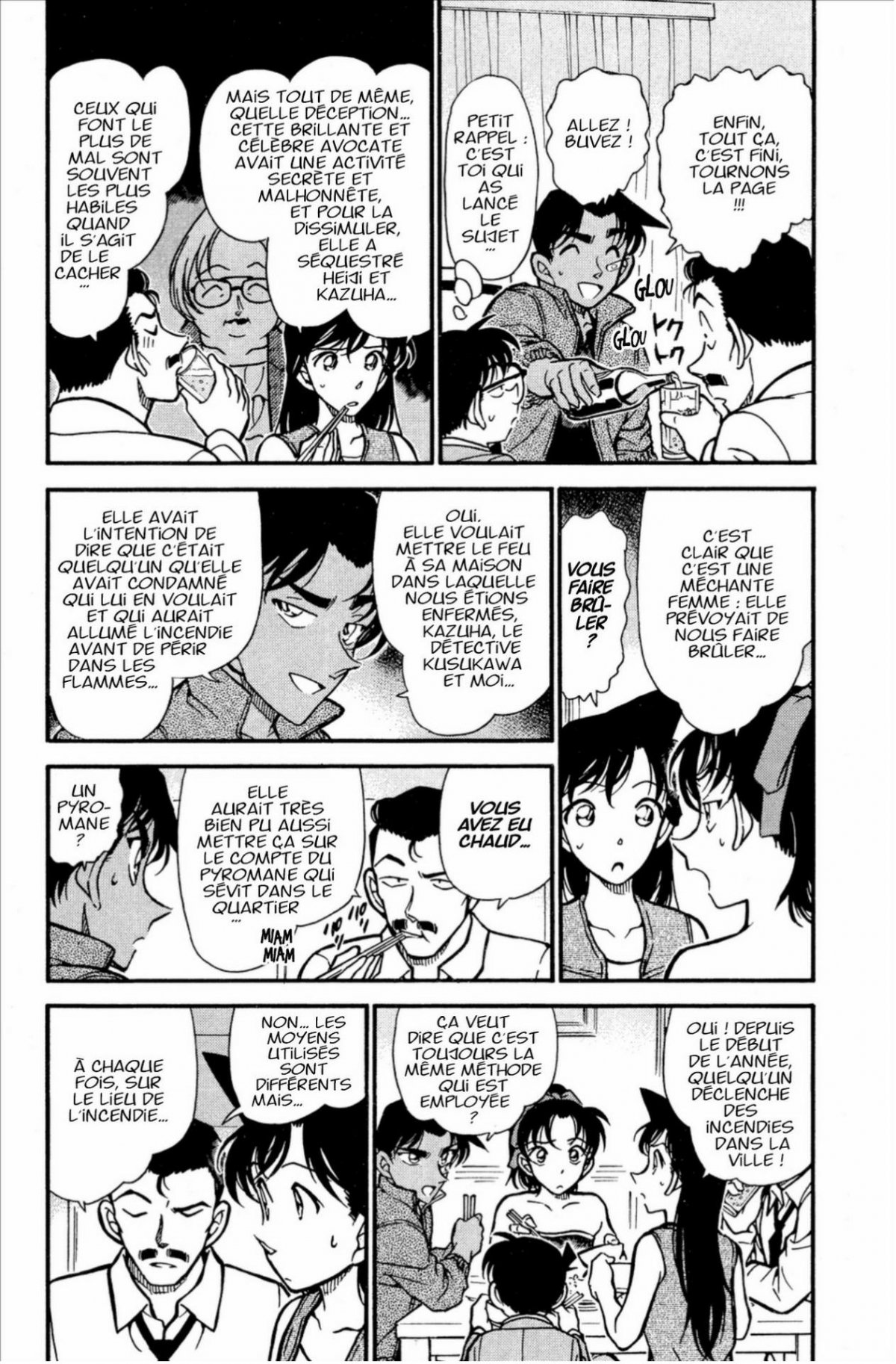 Une cliente, venue demander à Mouri d’enquêter sur quelqu’un qui la suivait, meurt dans l’incendie de sa maison quelques temps après ! Y aurait-il un rapport avec la série d’incendies qui ravagent le quartier d’Haido ces derniers temps ! L’étonnement est au rendez-vous lorsque Conan démasque le coupable !! Voici encore un volume où les enquêtes filent à 200 à l’heure !!