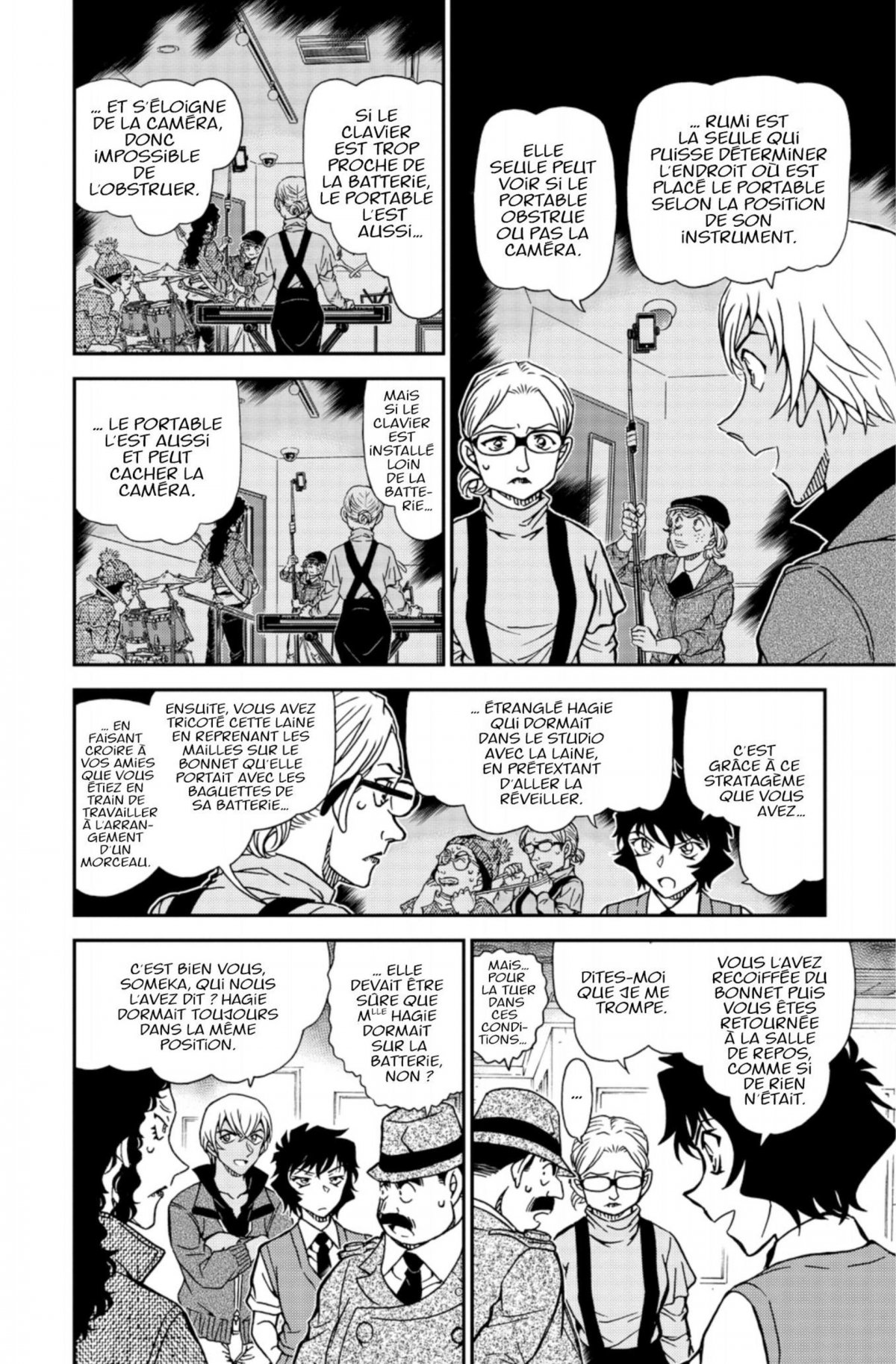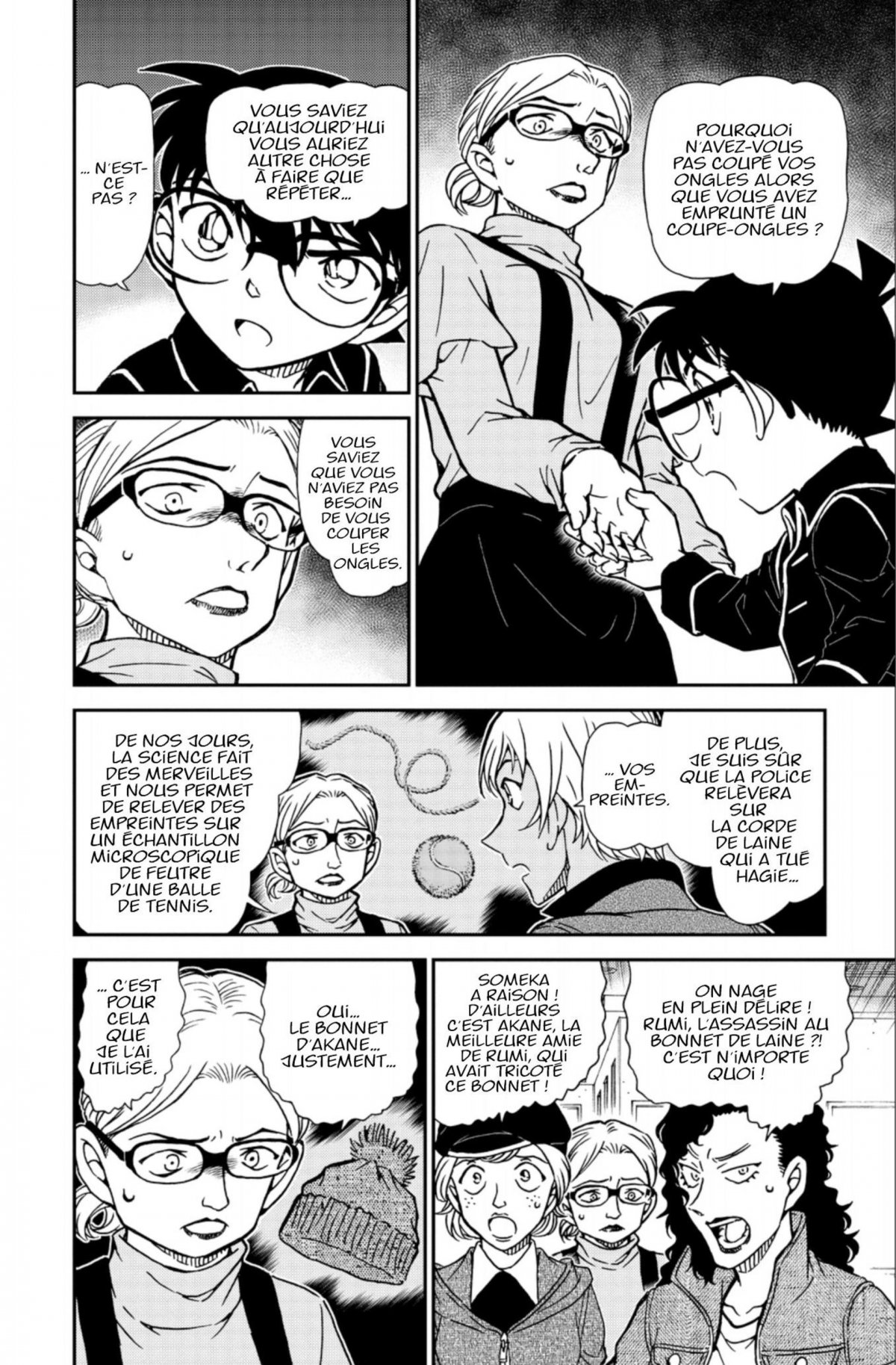Le meurtre de Mlle Hagie est sur le point d’être résolu ! La corde qui aurait servi à la tuer aurait été dissimulée dans son bonnet, en re tricotant par dessus. Bien sur, personne n’avait remarqué l’augmentation de la quantité laine sur le bonnet. Maintenant que la police sait le comment, ils vont devoir trouver le coupable. Conan pourrait bien avoir sa petite idée...