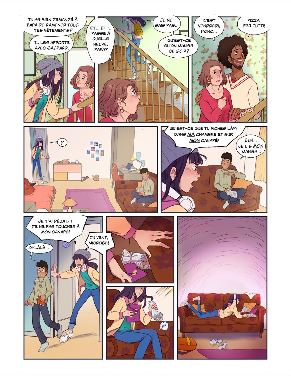 Quatre adolescents, quatre histoires différentes. Avec des points communs : un même établissement scolaire, et surtout une situation familiale compliquée par une séparation des parents... Pour Kim, c’est le déménagement de sa mère et le secret lié au vieux canapé de sa chambre qui est l’occasion de passer une étape dans l’acceptation de sa nouvelle situation. Douglas, lui, se retrouve balloté dans le conflit opposant son père et sa mère. Comment faire entendre sa propre voix, quand aucun des adultes autour ne semblent y faire attention ? Quand Lily débarque chez son père et sa belle-mère, elle découvre l’existence de sa demi-soeur Lila. Une nouvelle sacrément difficile à avaler, jusqu’à ce que les filles aient l’occasion de s’apprivoiser... Quant à Sascha, son quotidien d’enfant de divorcés semble relativement heureux car, des deux côtés, le cadre est bienveillant. Mais le point d’ancrage de son existence l’attend dans le bus qui relie ses deux vies, où une belle jeune fille inconnue se tient toujours à la même place. Une oasis de grâce suspendue à l’équilibre fragile de l’organisation familiale... Quatre ados, quatre destins. Et quatre regards singuliers et complémentaires sur une vie passée "1 toit 2 chez soi" !
