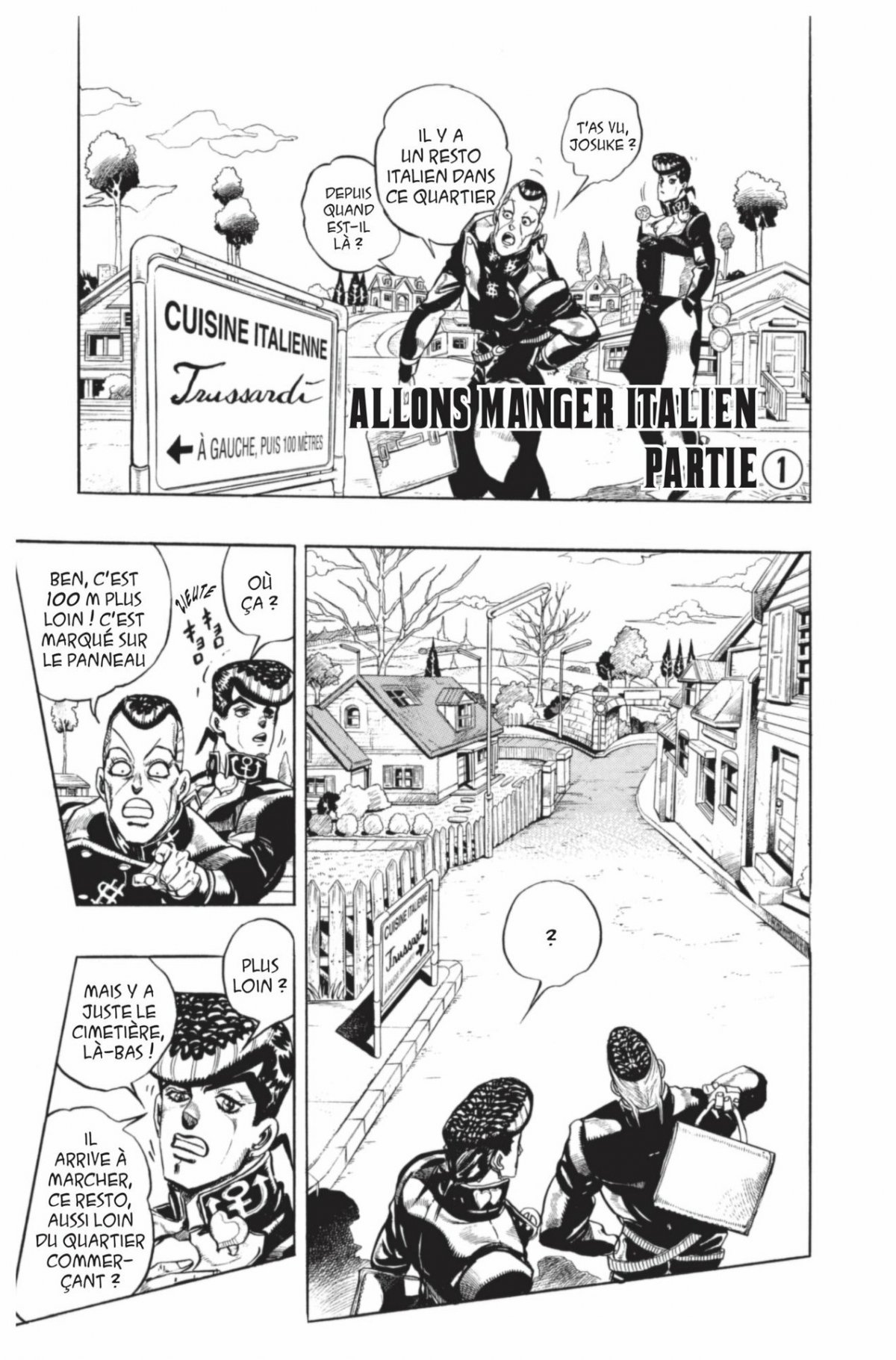 Josuke et Okuyasu découvrent par hasard l’enseigne d’un nouveau restaurant italien. Le chef leur prépare alors des plats aux goûts aussi délicieux que leurs effets sont percutants. Nos deux compères sont-ils tombés dans les griffes d’un nouveau manieur de Stand ? Pendant ce temps, une vieille connaissance s’apprête à arriver en ville.