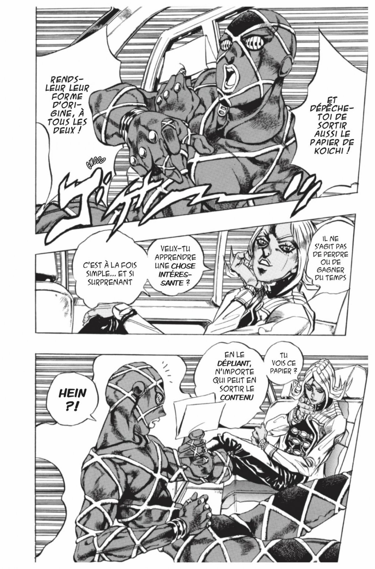 Pour sauver Josuke et Koichi transformés en feuilles de papier par le stand Enigma, Yuya Fungami décide de lancer Highway Star aux trousses de leur ennemi ! Mais il est clair que ce dernier a plus d’un piège à lui tendre. Pendant ce temps, Hayato, le fils des Kawajiri, est de plus en plus suspicieux avec son père, qu’il pense être un usurpateur. Il décide alors de le suivre en cachette, et ce qu’il découvre confirme ses soupçons les plus sinistres !