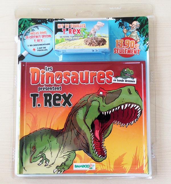 Une BD spéciale T. Rex à rugir de rire, accompagnée d’un kit de fouilles paléontologiques ! Pourquoi le T. Rex avait de si petits bras ? Quelles étaient ses techniques de chasse ? Toutes les facettes du Tyrannosaurus Rex sont dévoilées dans ce coffret, grâce à un album conciliant humour et informations scientifiques. Plus qu’une simple BD, vous y trouverez des gags issus de la série Les Dinosaures en BD, enrichis de 20 pages d’informations et d’images inédites sur le T. Rex et ses proches cousins. Et pour prolonger le plaisir des paléontologues en herbe, un kit de fouilles est inclus, avec un bloc à creuser pour trouver son fossile !