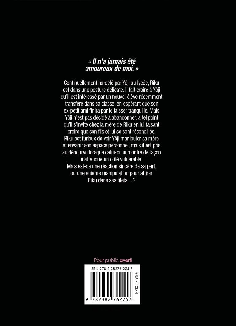 Continuellement harcelé par Yôji au lycée, Riku est dans une posture délicate. Il fait croire à Yôji qu’il est intéressé par un nouvel élève récemment transféré dans sa classe, en espérant que son ex-petit ami finira par le laisser tranquille. Mais Yôji n’est pas décidé à abandonner, à tel point qu’il s’invite chez la mère de Riku en lui faisant croire que son fils et lui se sont réconciliés. Riku est furieux de voir Yôji manipuler sa mère et envahir son espace personnel, mais il est pris au dépourvu lorsque celui-ci lui montre de façon inattendue un côté vulnérable. Mais est-ce une réaction sincère de sa part, ou une énième manipulation pour attirer Riku dans ses filets...?