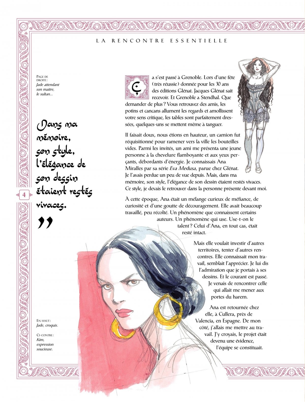 Istambul. Pour le scénariste Jean Dufaux, la ville présentait une culture d’une richesse exceptionnelle et une fracture : la fin du puissant Empire ottoman. Cette culture et cette fracture se retrouvaient dans un espace à la fois fermé et ouvert à tous les fantasmes : le harem. Mais en faire le cadre d’une BD, c’était risquer les clichés boiteux et les maniérismes machistes. Le choix d’une dessinatrice s’imposait. Une sensibilité féminine permettrait de garder une certaine distance entre l’objet décrit et les sensations que cet objet pouvait dégager
