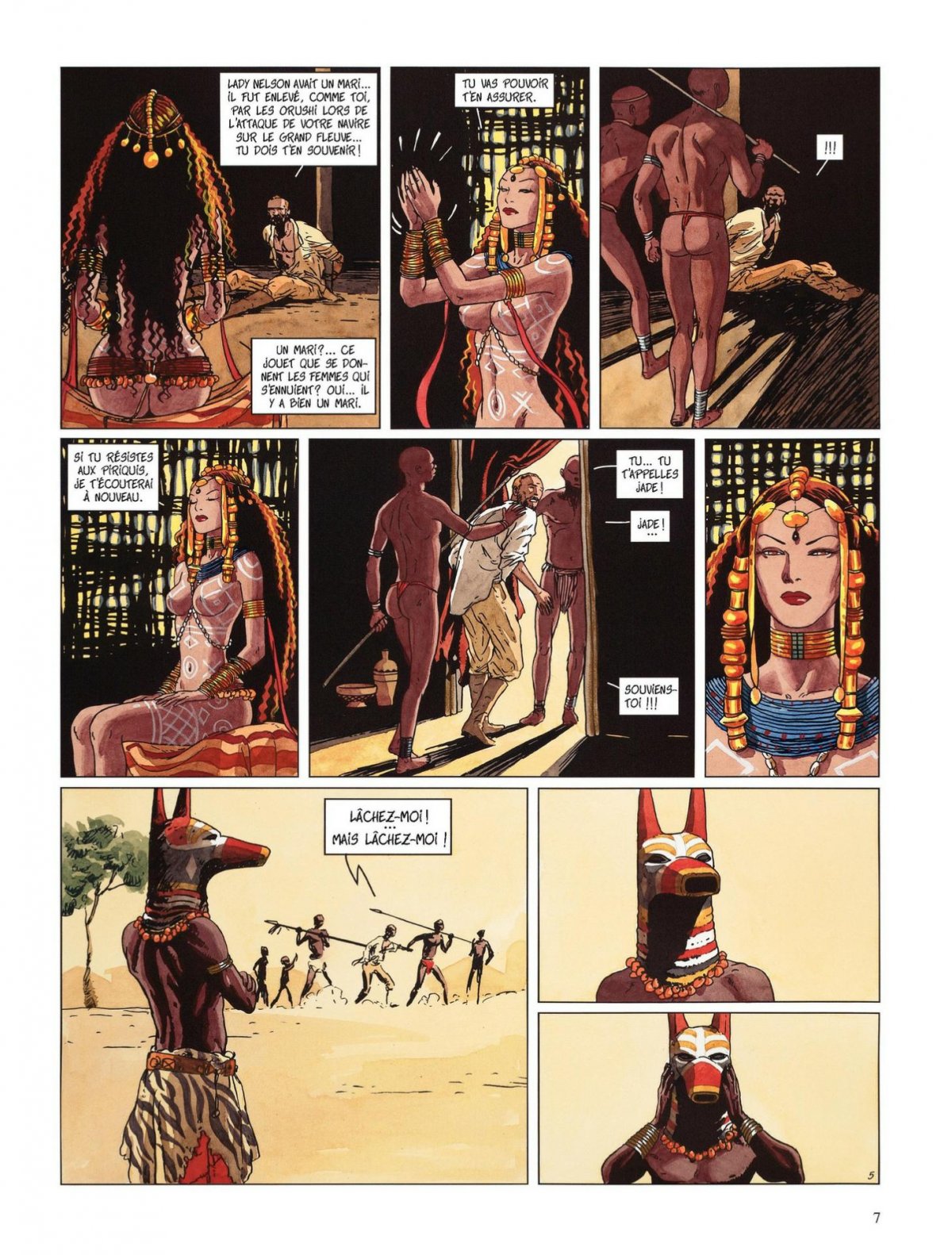 La femme vue par Ana Miralles a quelque chose de divin -, ce septième tome ose une violence peu commune au coeur d’une Afrique en proie à la révolte... Jean Dufaux dévoile le tragique destin de Lord Nelson et de son épouse, tout en insufflant à Jade un machiavélisme qui surprendra bien des lecteurs. Quant au somptueux dessin d’Ana Miralles, il nous dévoile une Afrique d’une rare férocité.