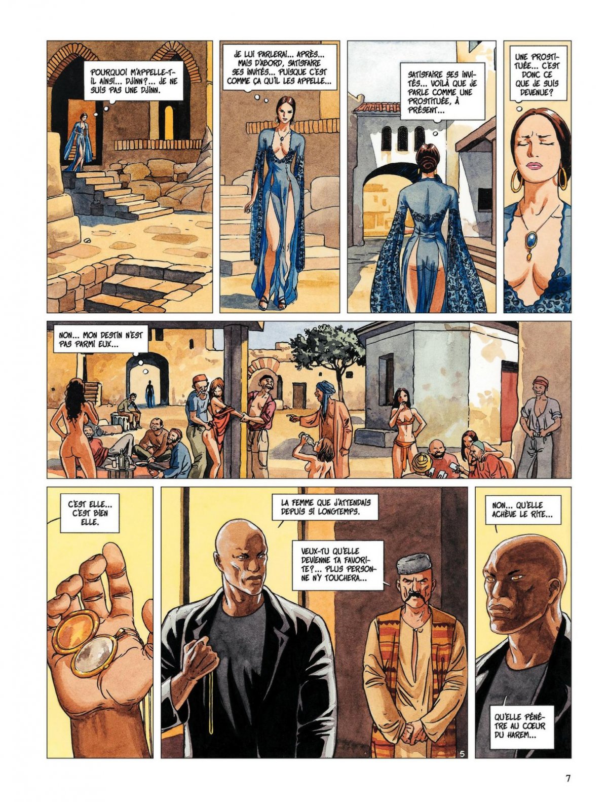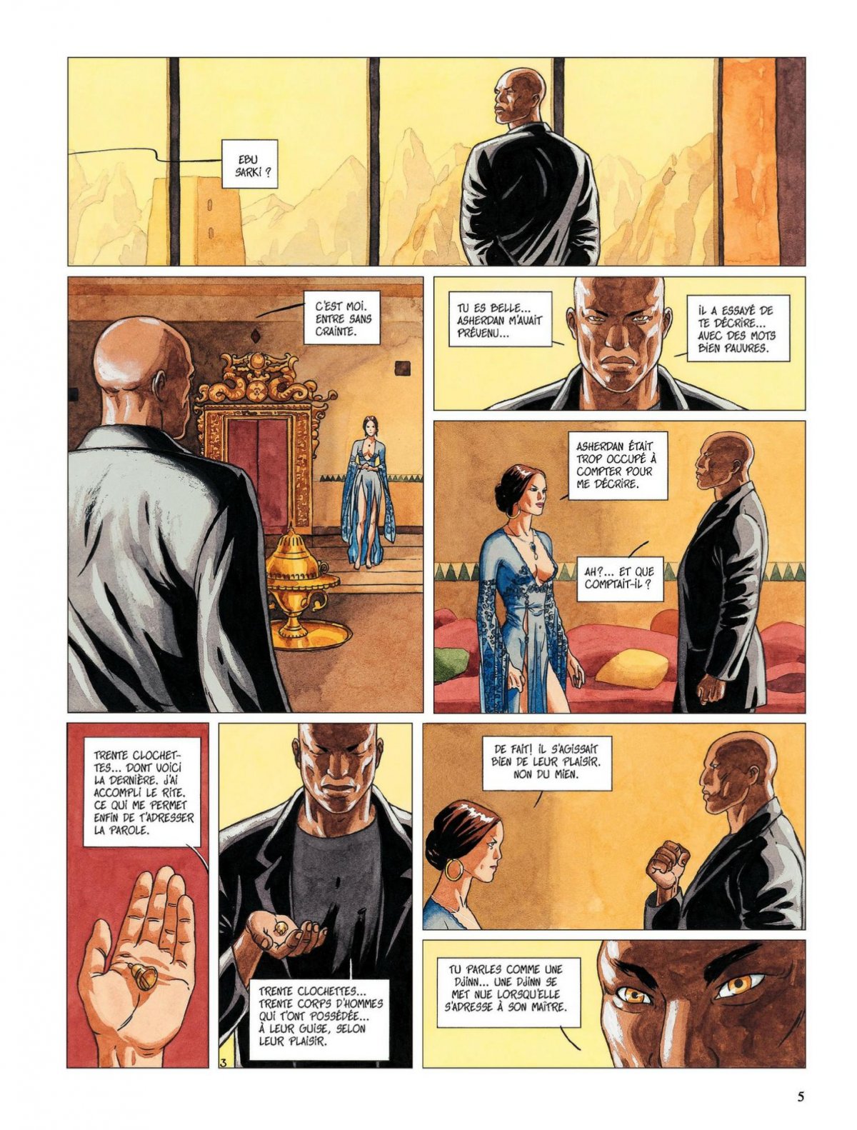 Tout concourt à faire de Djinn une série envoûtante. Elle agit sur l’esprit du lecteur à la manière du regard fixe du serpent se dressant dans son panier sous le charme d’un air de flûte. Le scénario de Dufaux, avec ses incessants va-et-vient entre passé et présent, dissipe les contours de la réalité et fait basculer en permanence le récit dans le rêve. Et les courbes du dessin délié d’Ana Mirallès, comme en écho aux volutes de fumée échappées des narguilés, baigne Djinn dans un climat de sensualité et de raffinement..