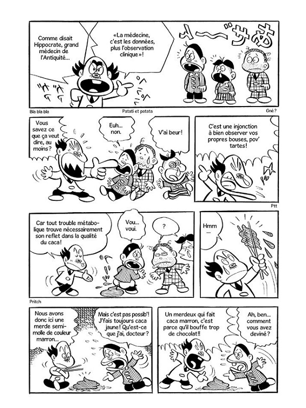 Authentique manga publié à partir de 1970 dans les pages du magazine Weekly Shonen Jump au Japon, Doc- teur Toilette raconte les aventures tonitruantes d’un ex- pert en caca. Entouré d’une bande de gamins montés sur piles et secondé par Miss Caca, sa délicieuse asssistante, le savant vaniteux tente d’instruire tant bien que mal le lecteur sur les nombreuses qualités de l’art de la selle. Donnant lieu à une suite de gags absurdes - qui n’au- raient rien à envier à un épisode de South Park - cet ovni de la bande dessinée japonaise nous entraîne dans un tourbillon de blagues potaches. Visage en forme de fesses, jets d’urine, crottes élastiques, pets en série ou seau de morve, c’est ici tout le champs lexical de la dé- goûtation qui est décliné. Déjanté et farfelu, Docteur Toilette emprunte le registre du cartoon pour enchaîner les situations grotesques à un rythme frénétique. Les personnages, plus survoltés les uns que les autres, sont emblématiques du « Kakawaï », cette mouvance typiquement japonaise qui consiste à transformer le répugnant en mignon. Unique en son genre, Docteur Toilette fut un énorme succès au japon, sa transgression des tabous hygiénistes lui attirant l’admi- ration d’écoliers horrifiés, qui le plaçaient fréquemment en tête des sondages du Weekly Shonen Jump. On avait entendu parler du Musée de la Crotte qui a ouvert ses portes en 2015 à Tokyo ; on connaît désormais son équivalent littéraire, le Docteur Toilette, un person- nage cacatastrophique et pipitoyable mais popotentiel- lement génial !