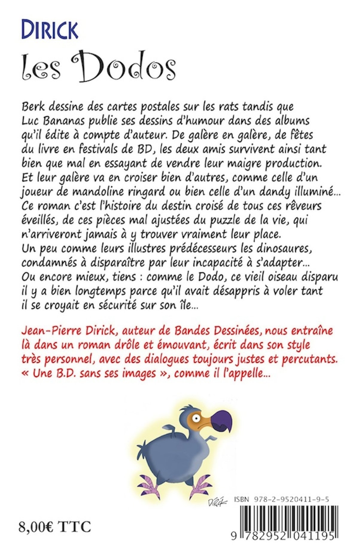 Berk dessine des cartes postales sur les rats tandis que Luc Bananas publie ses dessins d’humour dans des albums qu’il édite à compte d’auteur. De galère en galère, de fêtes du livre en festivals de BD, les deux amis survivent ainsi tant bien que mal en essayant de vendre leur maigre production. Et leur galère va en croiser bien d’autres, comme celle d’un joueur de mandoline ringard ou bien celle d’un dandy illuminé… Ce roman c’est l’histoire du destin croisé de tous ces rêveurs éveillés, de ces pièces mal ajustées du puzzle de la vie, qui n’arriveront jamais à y trouver vraiment leur place. Un peu comme leurs illustres prédécesseurs les dinosaures, condamnés à disparaître par leur incapacité à s’adapter… Ou encore mieux, tiens : comme le Dodo, ce vieil oiseau disparu il y a bien longtemps parce qu’il avait désappris à voler tant il se croyait en sécurité sur son île…