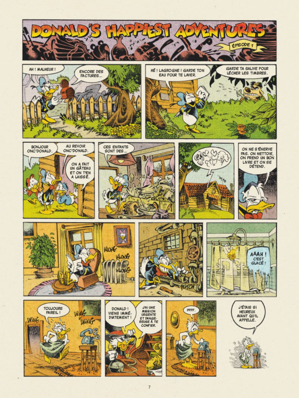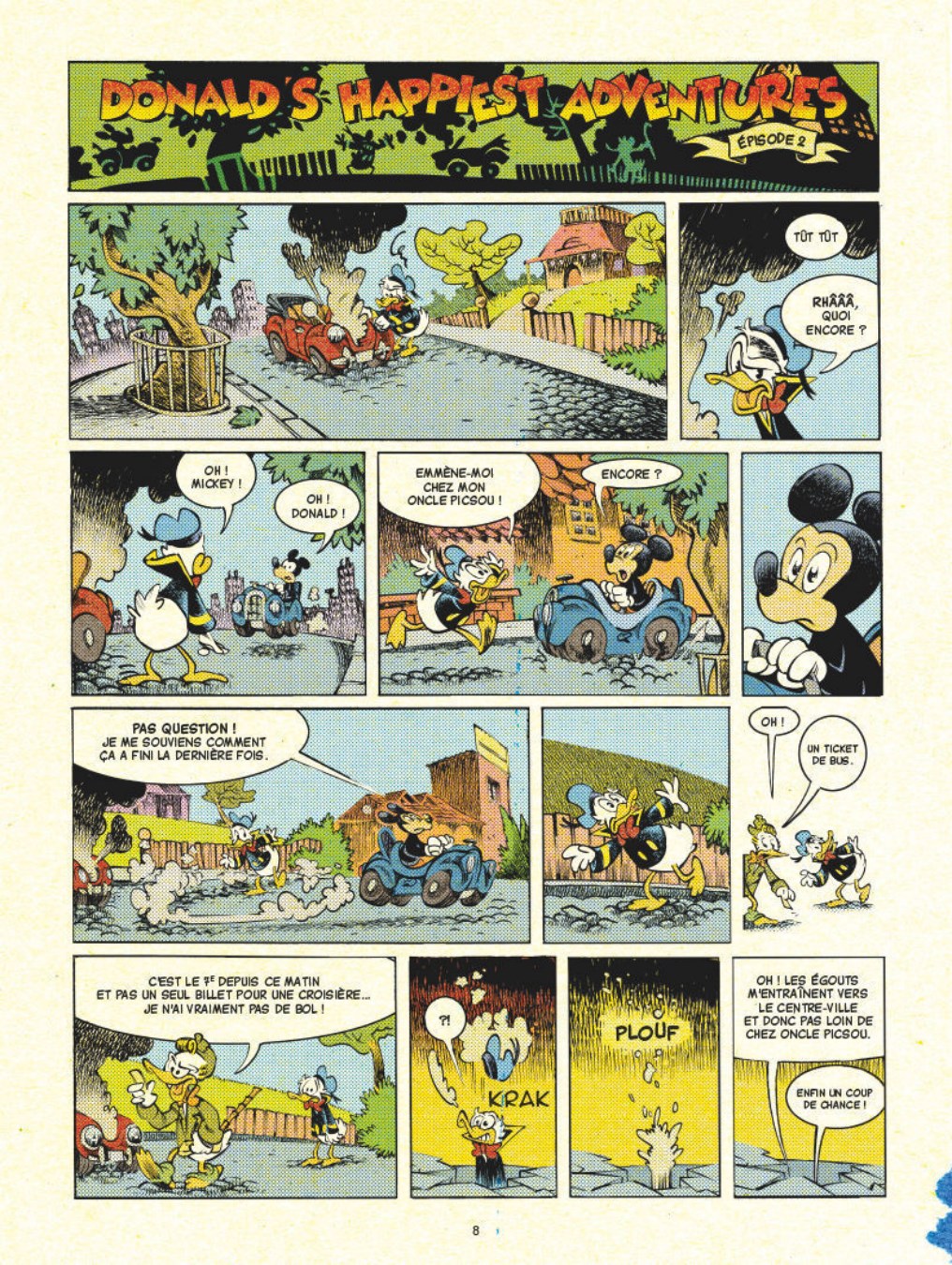 À la recherche du bonheur Un matin comme les autres : Donald se lève de la patte gauche et reçoit un appel de Picsou. Après leurs aventures aux quatre coins du monde avec Mickey, son oncle a besoin de lui pour une nouvelle chasse au trésor. Mais Donald se rend compte que, peu importe l’étendue des richesses qu’il lui envoie chercher, son oncle ne sera jamais satisfait. Picsou a beau être un vieux canard pingre et acariâtre, il veut la même chose que tout le monde : le bonheur. Aussi décide-t-il d’envoyer son neveu à la recherche de cet inestimable trésor ! Mais pour le colérique et malchanceux Donald, trouver le secret du bonheur semble mission impossible...Conçu sur un principe d’épisodes similaire à Mickey’s Craziest Adventures (mais dont on a cette fois-ci retrouvé tous les numéros), ce nouvel album plonge Donald dans une quête initiatique à la découverte du monde, des autres mais aussi de lui-même. Ainsi, sous couvert d’humour et d’aventure rocambolesque, Lewis Trondheim et Nicolas Keramidas explorent cette fois toutes les grandes notions philosophiques du bonheur.