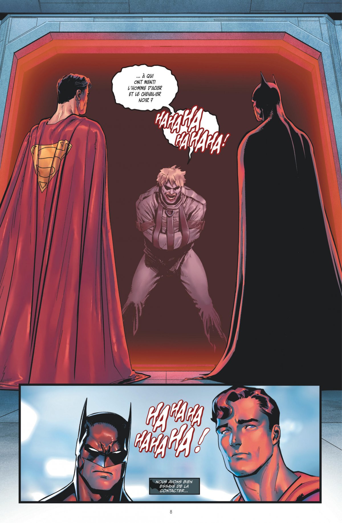 Alors qu’il vient de remporter une victoire décisive dans sa guerre contre les Justice League unies du Multivers, Lex Luthor pensait débuter son règne en préparant l’avènement de sa reine Perpetua sur Terre. Surgissant des ténèbres, entourés de ses agents infectés, le Batman Qui Rit entend cependant réclamer son dû et, pourquoi pas, récupérer la part du lion au passage. Le duel entre les deux prédateurs ultimes changera pour longtemps la face du monde.