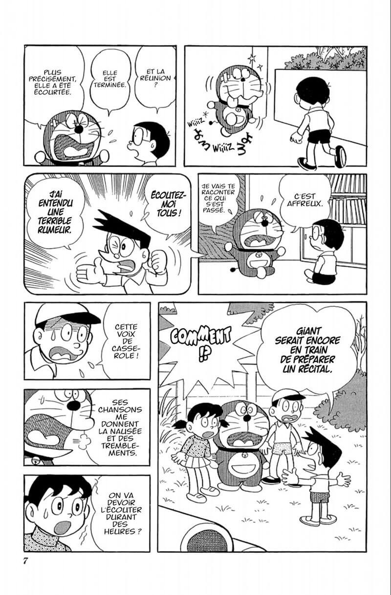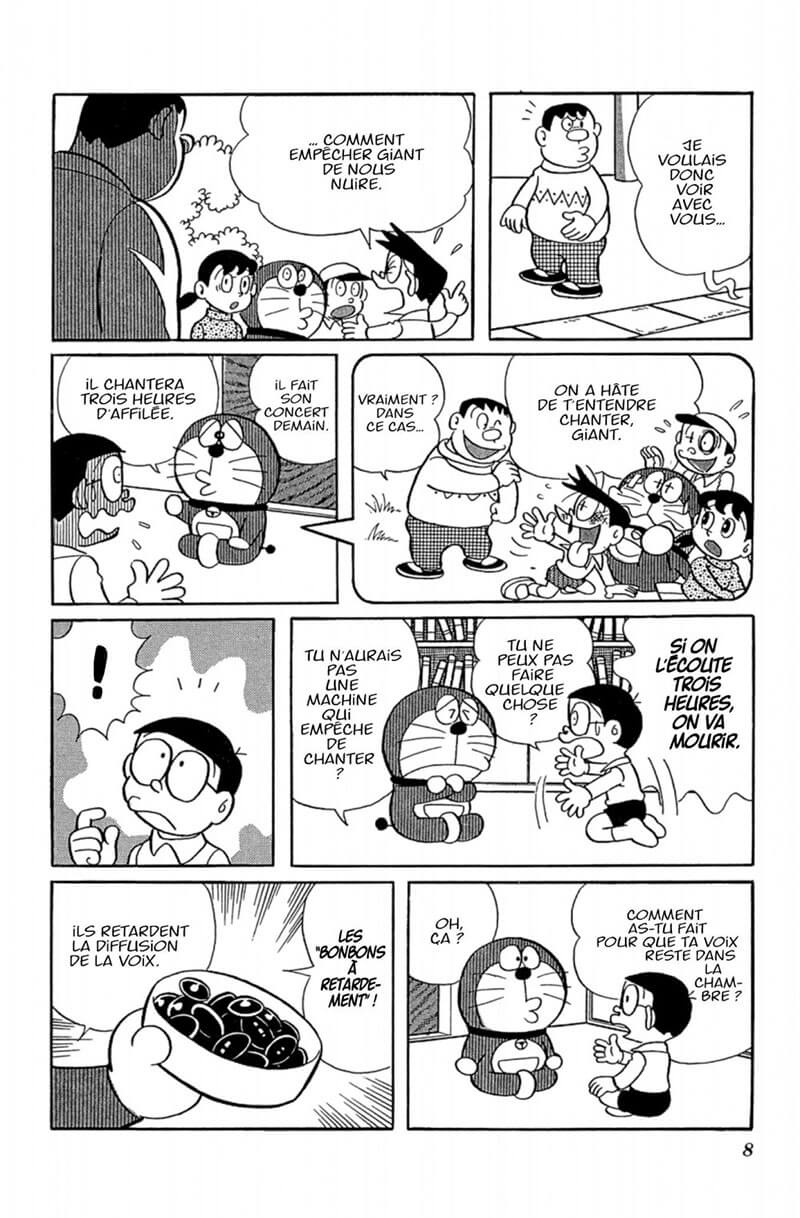 L’heure est grave ! Une terrible rumeur circule ! Giant préparerait un récital pour son prochain concert. Un concert de trois heures qu’il compte donner devant tous ses amis ! Nobita et ses amis sont terrorisés à l’idée d’entendre chanter ce petit caïd ! Heureusement, DORAemon a plus d’un tour dans son sac et utilisera des bonbons à retardement pour éviter le pire ! Mais attention aux effets contraires de ces friandises ! Une astuce parmi tant d’autres que DORAemon proposera à Nobita pour s’extirper des situations les plus farfelues !
