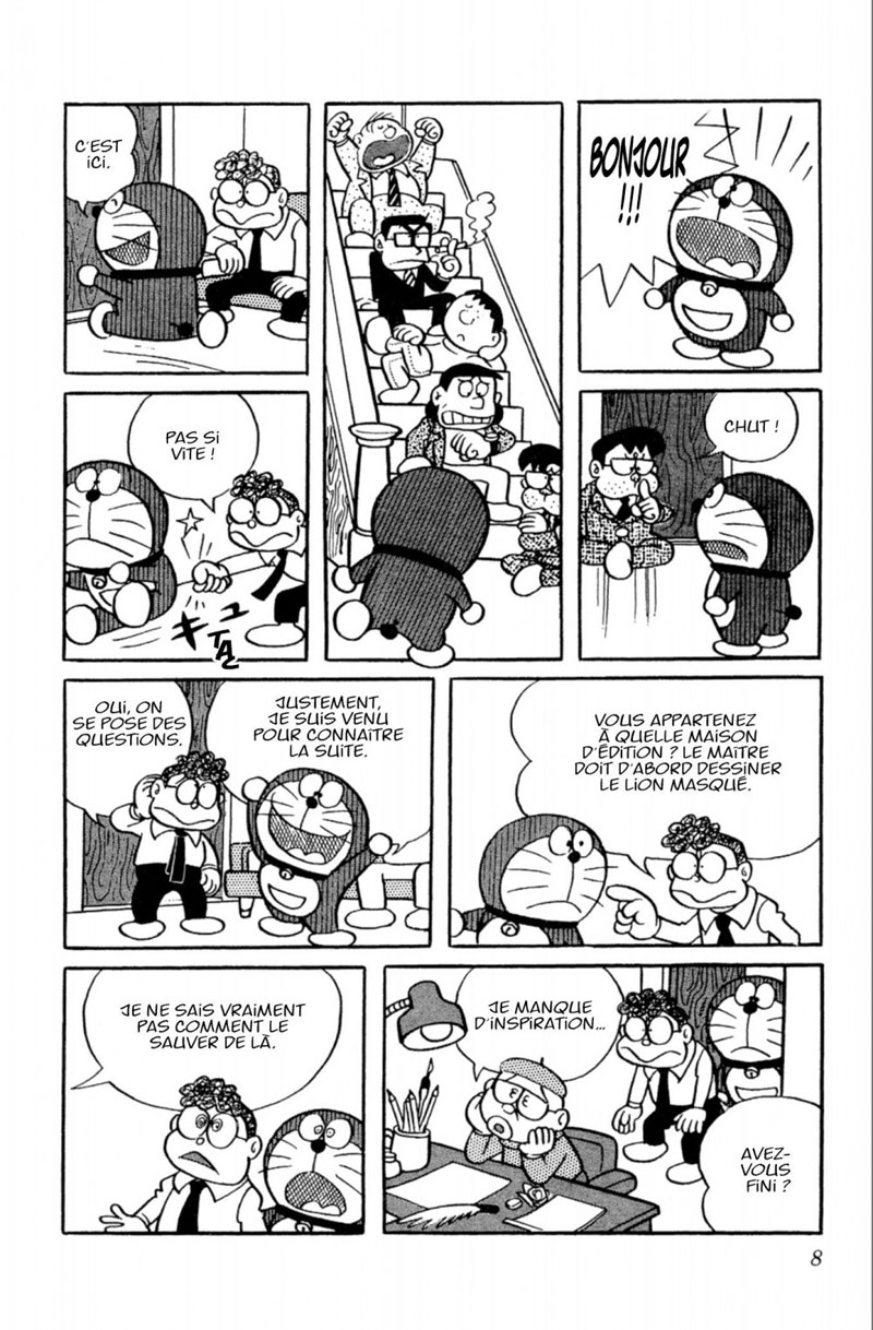 Dans la première histoire, le Lion masqué, le héro de manga préféré de Nobita, est en mauvaise posture ! Quel supplice pour Doraemon et Nobita qui ne peuvent pas se résoudre à patienter jusqu’à la prochaine publication. Doraemon décide de rendre visite à l’auteur de la série. Peine perdue, celui-ci est en panne d’inspiration. Doreamon se rend alors dans le futur pour lire la suite de l’histoire... !! Dans la foulée, nos deux compères testeront, entre autres, le "calendrier modifiable", "l’appareil à mensonges" ou "la machine à échanger les mamans"... autant de catastrophes en perspectives !