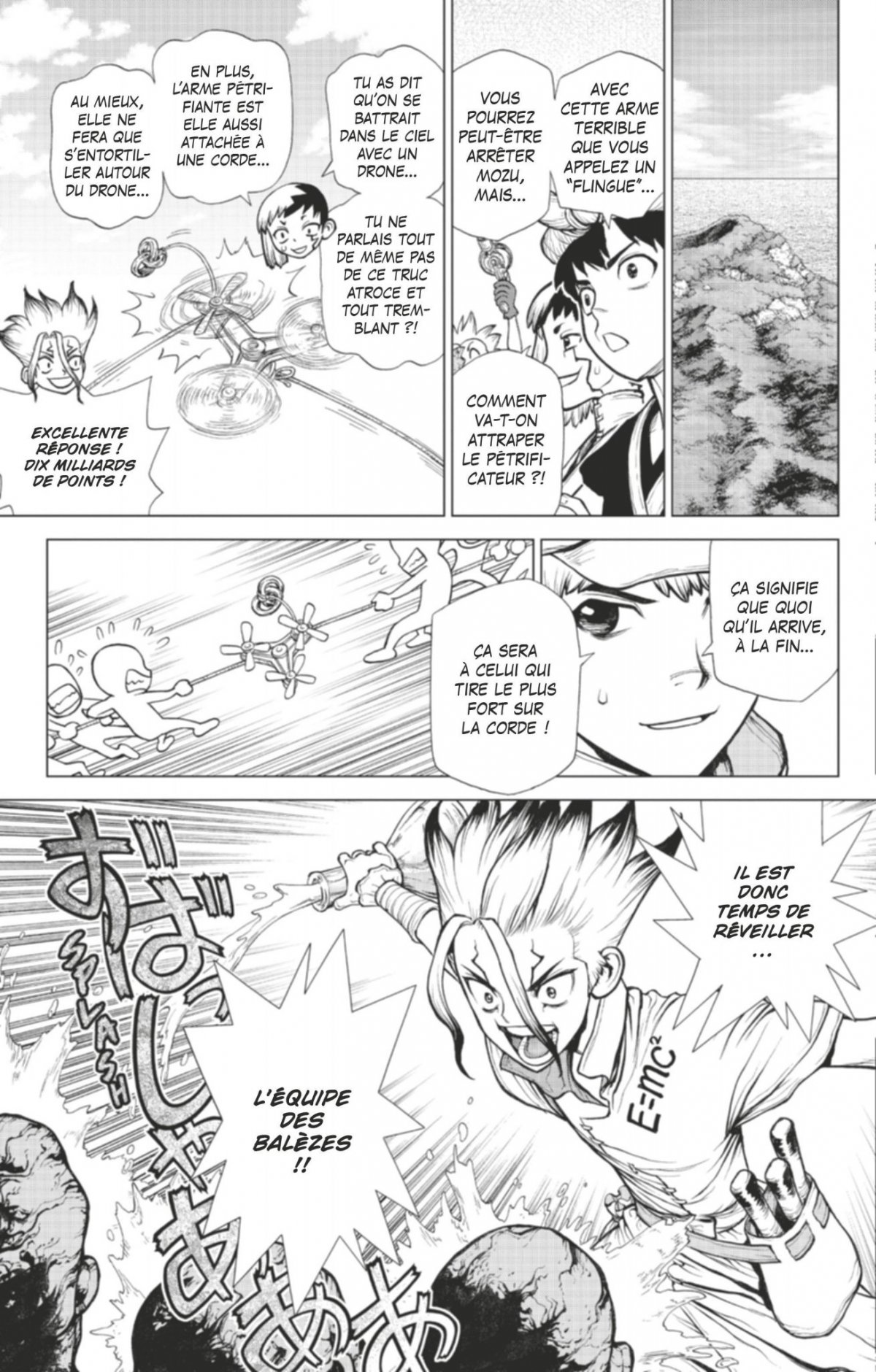 Les partisans du royaume de la science sortent de la pierre les uns après les autres. Senku et ses amis lancent les premières manoeuvres concrètes visant à la capture de l’arme pétrifiante. Avec toutes sortes d’équipements scientifiques en main, ils déclenchent la bataille finale contre Mozu et le royaume pétrifiant, mais se retrouvent face à un écueil totalement imprévu !L’arc narratif de l’île au trésor atteint son point d’orgue !!