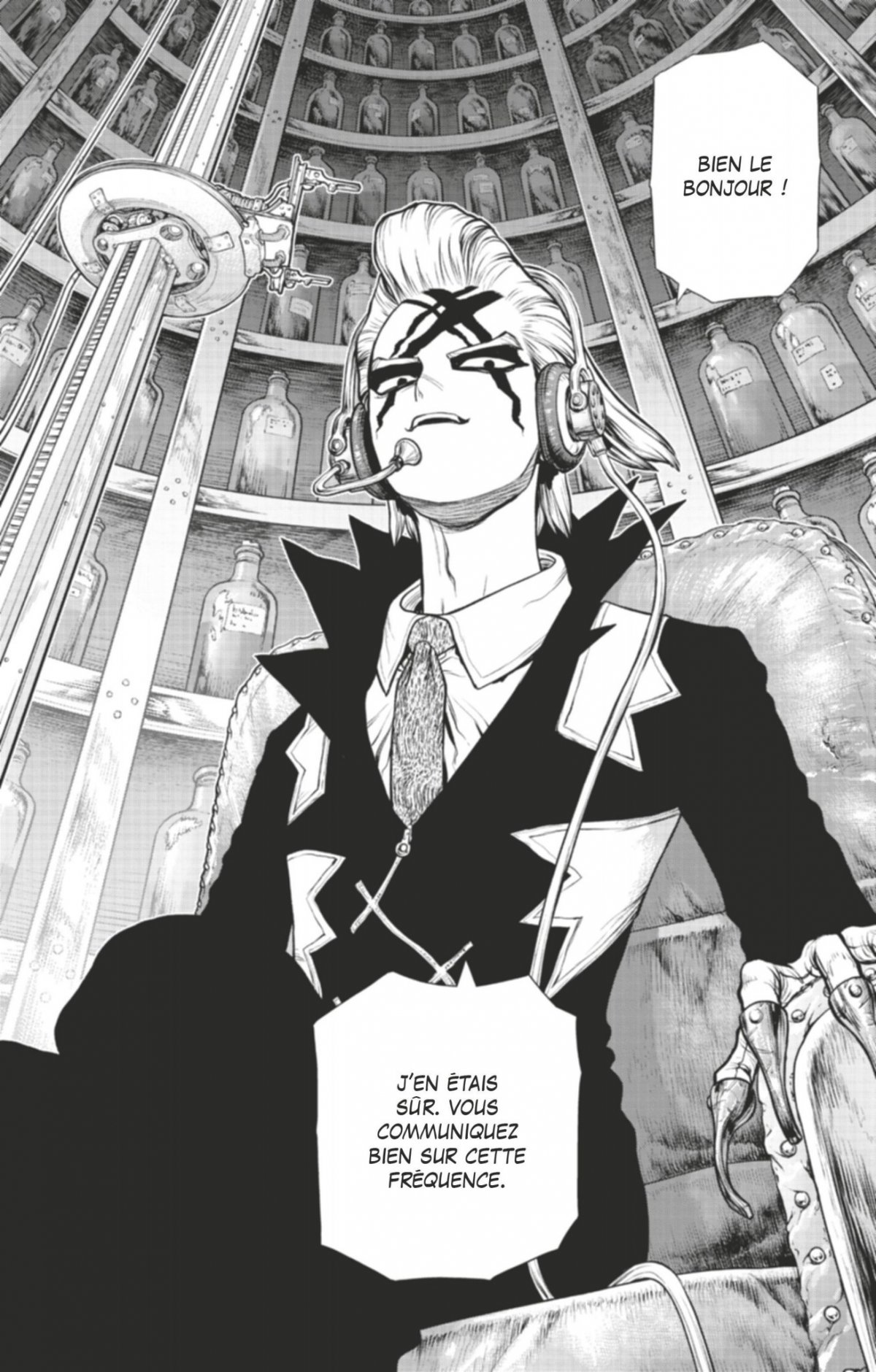 Le combat entre les deux chercheurs, Senku et le Dr. Xeno, prend la forme de deux attaques éclair, chacune visant le leader scientifique du camp opposé