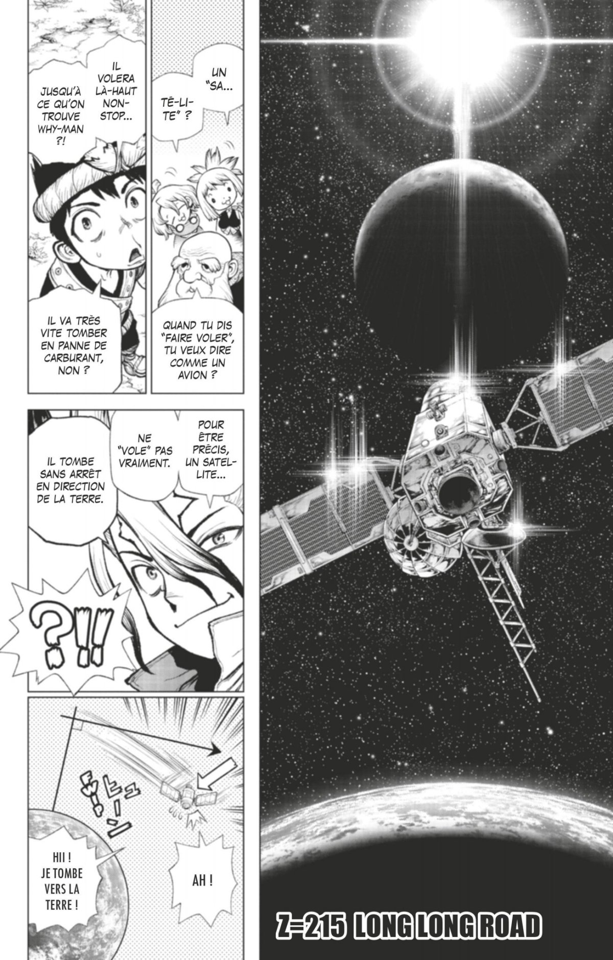 Une grande séance de bricolage scientifique est sur le point de commencer : nos héros vont construire le satellite artificiel qui permettra de localiser Why-man à la surface de la Lune ! Le lancement de la fusée s’avère plus difficile que prévu, mais Senku et Xeno forment un duo scientifique au top, qui ne perd jamais courage !! De leur côté, Chrome et Suika cherchent en secret un moyen d’effectuer un voyage aller-retour de la Terre à la Lune !
