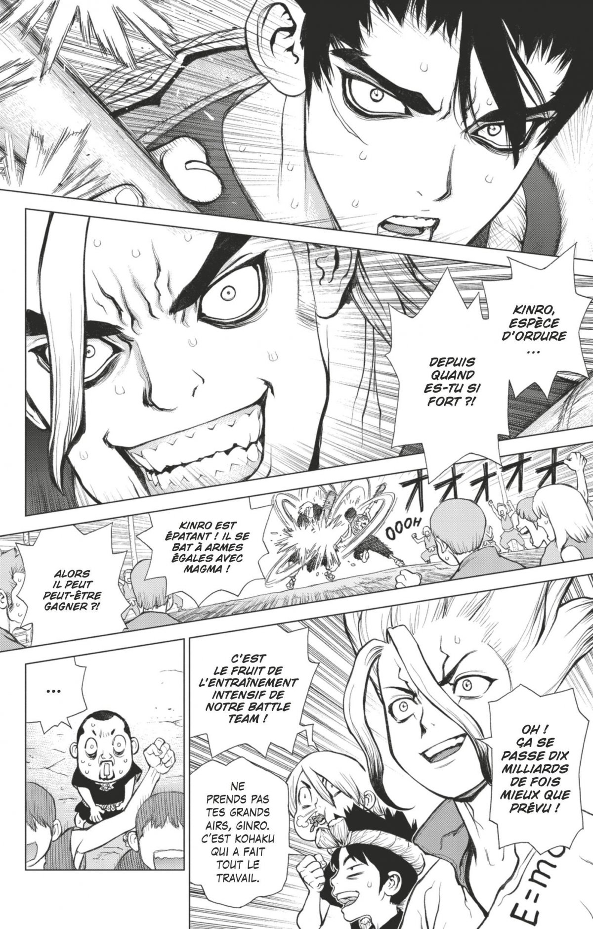 Le tournoi seigneurial a commencé !Représentant le royaume de la science, Kinro affronte Magma dès le premier tour. Sa myopie rend l’affrontement très difficile car Magma garde ses distances. Mais une fois revêtus les "yeux de la science", voilà que Kinro reprend le dessus !Senku et ses alliés comptent sur la puissance de la science pour remporter la victoire !!