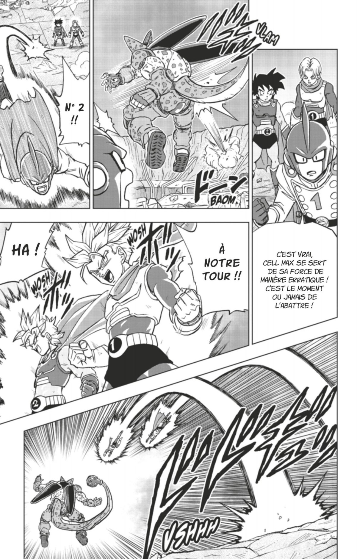 Cell Max, le plus puissant de tous les cyborgs, a été activé !! Gohan et ses amis lui font face, en compagnie des Gamma 1 et 2, mais ils doivent plier face aux attaques écrasantes du colosse ! Pour la première fois depuis bien longtemps, Piccolo se transforme en géant. S’enclenche alors une bataille extrême entre les deux titans !