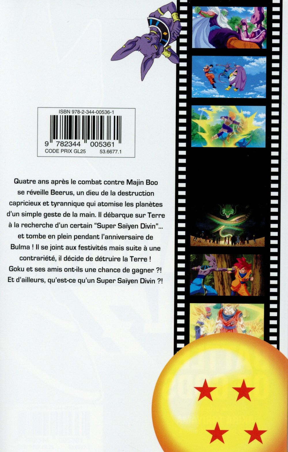 Le retour d’Akira Toriyama Quatre ans après le combat contre Majin Boo se réveille Beerus, un dieu de la destruction capricieux et tyrannique qui atomise les planètes d’un simple geste de la main. Il débarque sur Terre à la recherche d’un certain "Super Saïyen God"... et tombe en plein pendant l’anniversaire de Bulma ! Il se joint aux festivités mais suite à une contrariété, il décide de détruire la Terre ! Goku et ses amis ont-ils une chance de gagner ! Et d’ailleurs, qu’est-ce qu’un Super Saïyen God !