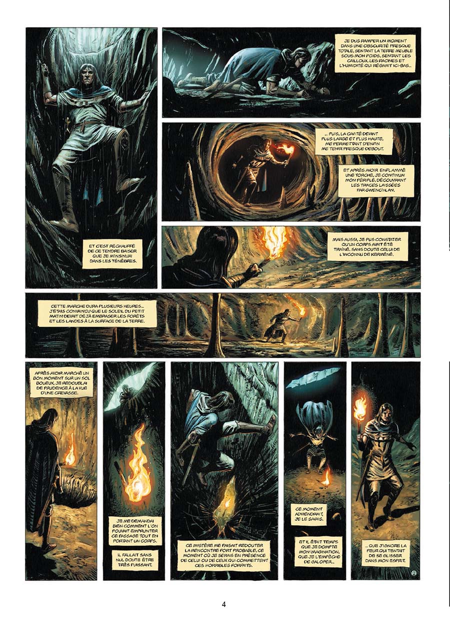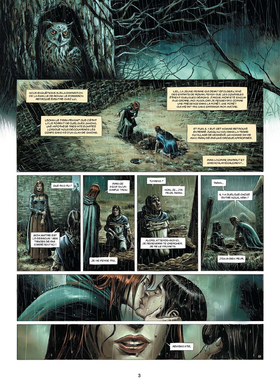 Les druides Gwenc’hlan et Taran enquêtent sur la disparition de la famille de Ronan le forgeron retrouvé éventré chez lui. Leonin le Tiern pensait que c’était là le forfait de quelques Saxons. Une hypothèse très vite écartée lorsqu’ils firent la découverte des cadavres d’un clan de Saxon. Liel, la jeune femme qui devait épouser l’aîné des enfants de Ronan, pense que les coupables sont quelques démons. Taran avoue avoir été enclin à le croire, lui aussi, car il ressent comme une présence dans la forêt. Une forêt qui n’est pas sans effrayer son maître. Il y a aussi cet homme retrouvé enterré jusqu’au cou dans la terre du village de Kerméné. Un homme en vie mais paralysé par une drogue. Mais l’homme a soudainement disparu durant la nuit, et Gwenc’hlan également... Taran est seul, la forêt abrite un sombre mystère, des galeries souterraines, des sanctuaires anciens et le seigneur du château d’Orient quant à lui, cache un lourd secret... .