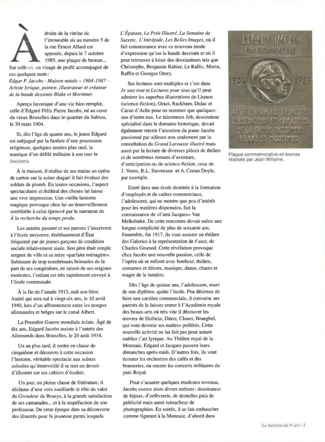 E.P.Jacobs, le baryton du 9e art est un album oneshot de Edgar Pierre Jacobs et Jean-Marc Guyard, paru en 1990. Selon nos informations, il n'en existe qu'une seule édition, publiée par Dargaud.