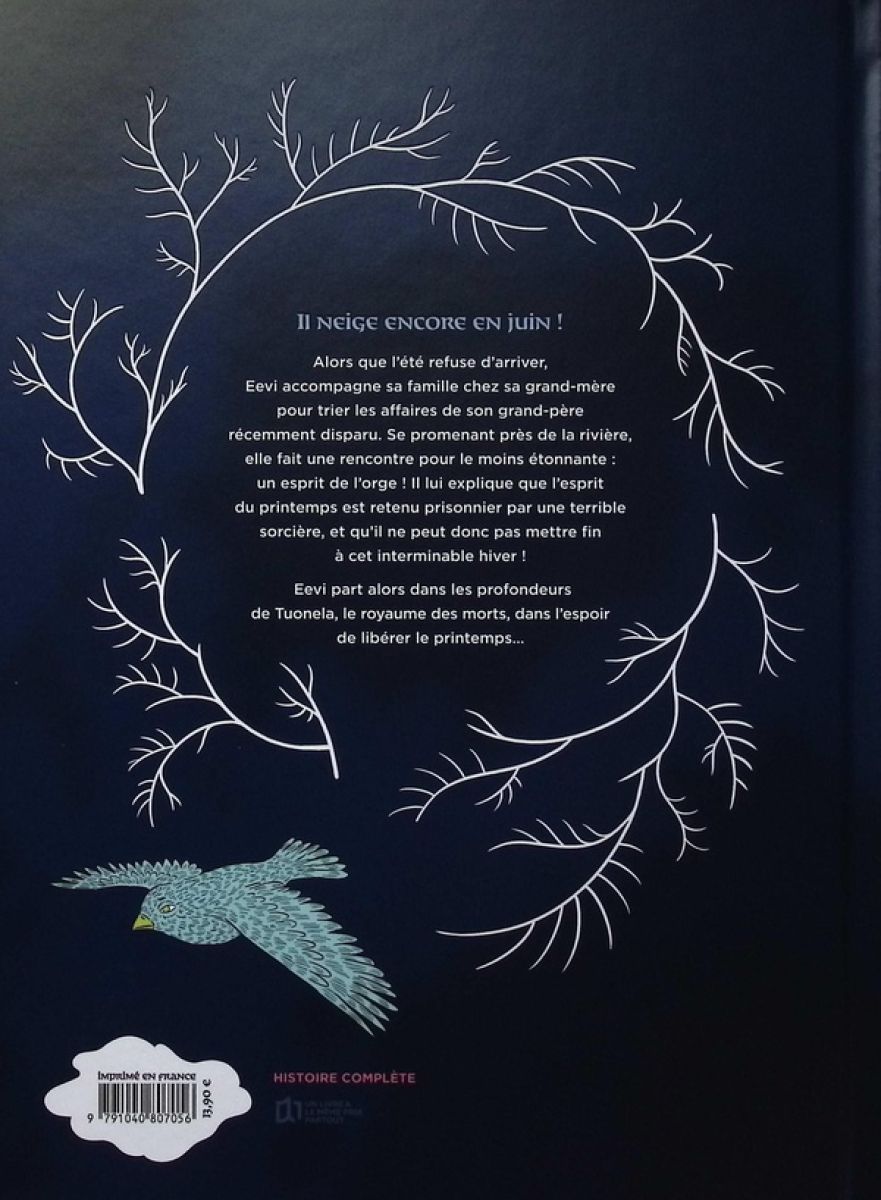 Il neige encore en juin ! Alors que l’été refuse d’arriver, Eevi accompagne sa famille chez sa grand-mère pour trier les affaires de son grand-père récemment disparu. Se promenant près de la rivière, elle fait une rencontre pour le moins étonnante : un esprit de l’orge ! Il lui explique que l’esprit du printemps est retenu prisonnier par une terrible sorcière et qu’il suffit de le libérer pour mettre fin à cet interminable hiver.