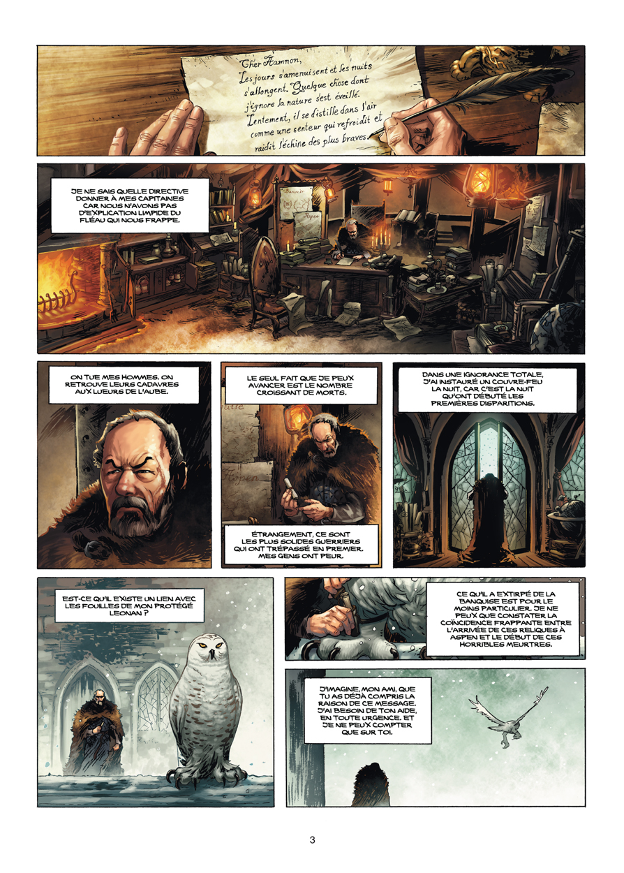 Les héros du tome 1 reviennent pour une enquête où se croisent mystère, horreur et mysticisme ! C’est dans la ville d’Aspen logée dans le froid du nord que commence cette histoire... Alors que les jours s’amenuisent et que les nuits s’allongent, quelque chose dont le régent d’Aspen ignore la nature s’est éveillé. Lentement, il se distille dans l’air comme une sensation qui refroidit et raidit l’échine des plus braves. On tue les hommes. On retrouve leurs cadavres aux lueurs de l’aube. Étrangement, ce sont les plus solides guerriers qui trépassent en premier. Puis leurs cadavres disparaissent... Les gens d’Aspen ont peur. Le régent implore l’aide d’Aamnon, le roi des Elfes bleus du Nord qui répond à sa requête. Une mission est envoyée dans le Nordrenn, une enquête menée par Lanawyn et Turin....