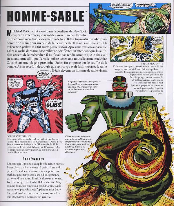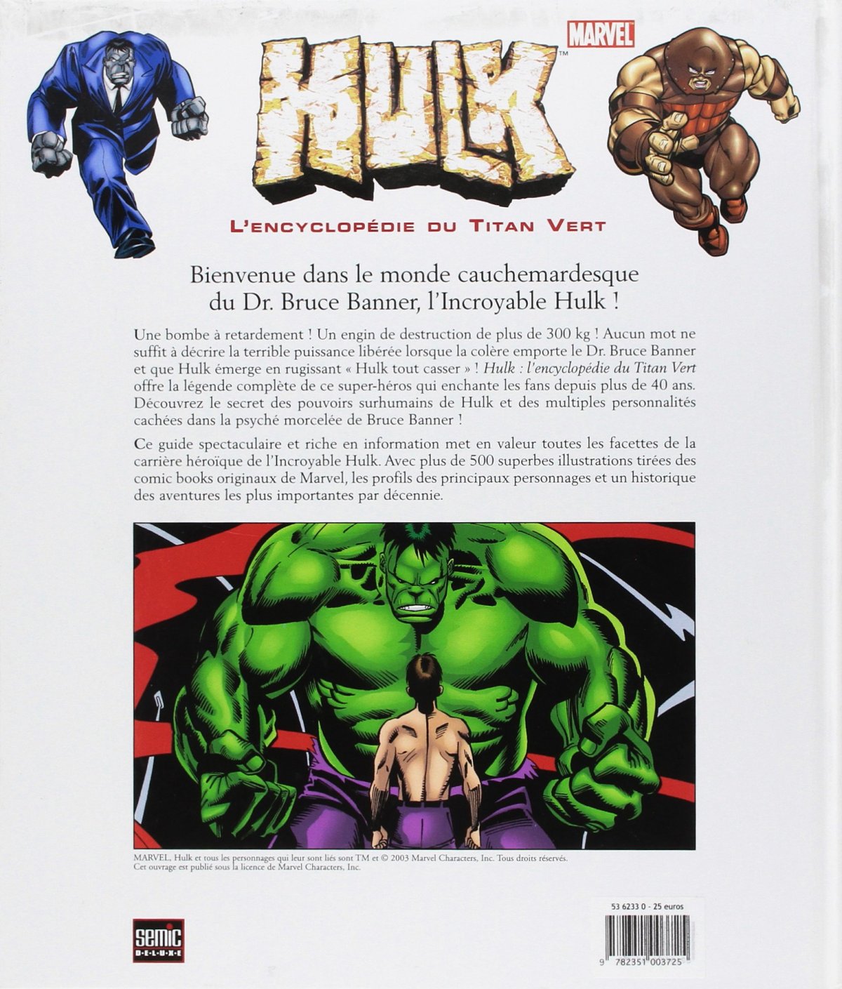 Bienvenue dans le monde cauchemardesque du Dr. Bruce Banner, l’Incroyable Hulk ! Une bombe à retardement ? Un engin de destruction de plus de 300 kg ? Aucun mot ne suffit à décrire la terrible puissance libérée lorsque la colère emporte le Dr. Bruce Banner et que Hulk émerge en rugissant Hulk tout casser ? Hulk : l’encyclopédie du Titan Vert offre la légende complète de ce super-héros qui enchante les fans depuis plus de 40 ans. Découvrez le secret des pouvoirs surhumains de Hulk et des multiples personnalités cachées dans la psyché morcelée de Bruce Banner ! Ce guide spectaculaire et riche en information met en valeur toutes les facettes de la carrière héroïque de l’Incroyable Hulk. Avec plus de 500 superbes illustrations tirées des comic books originaux de Marvel, les profils des principaux personnages et un historique des aventures les plus importantes par décennie.