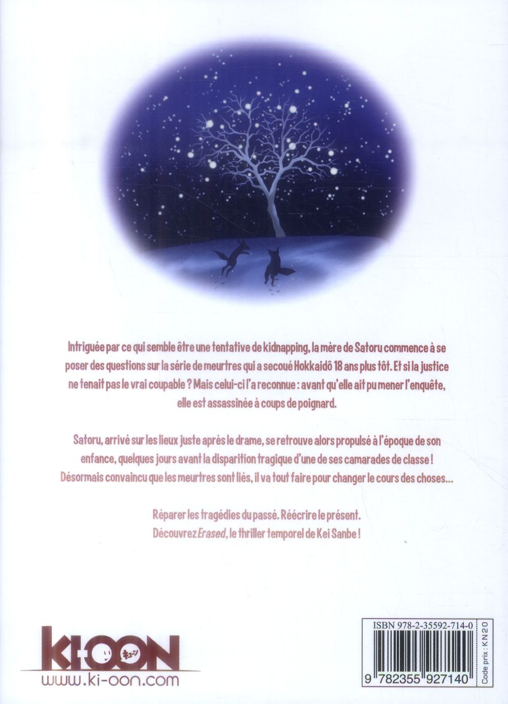 Erased 2 est le volume 2 de la série Erased par Kei Sanbe, paru en 2014. Selon nos informations, il en existe 2 éditions, dont la principale est éditée par Ki-oon en 2014.