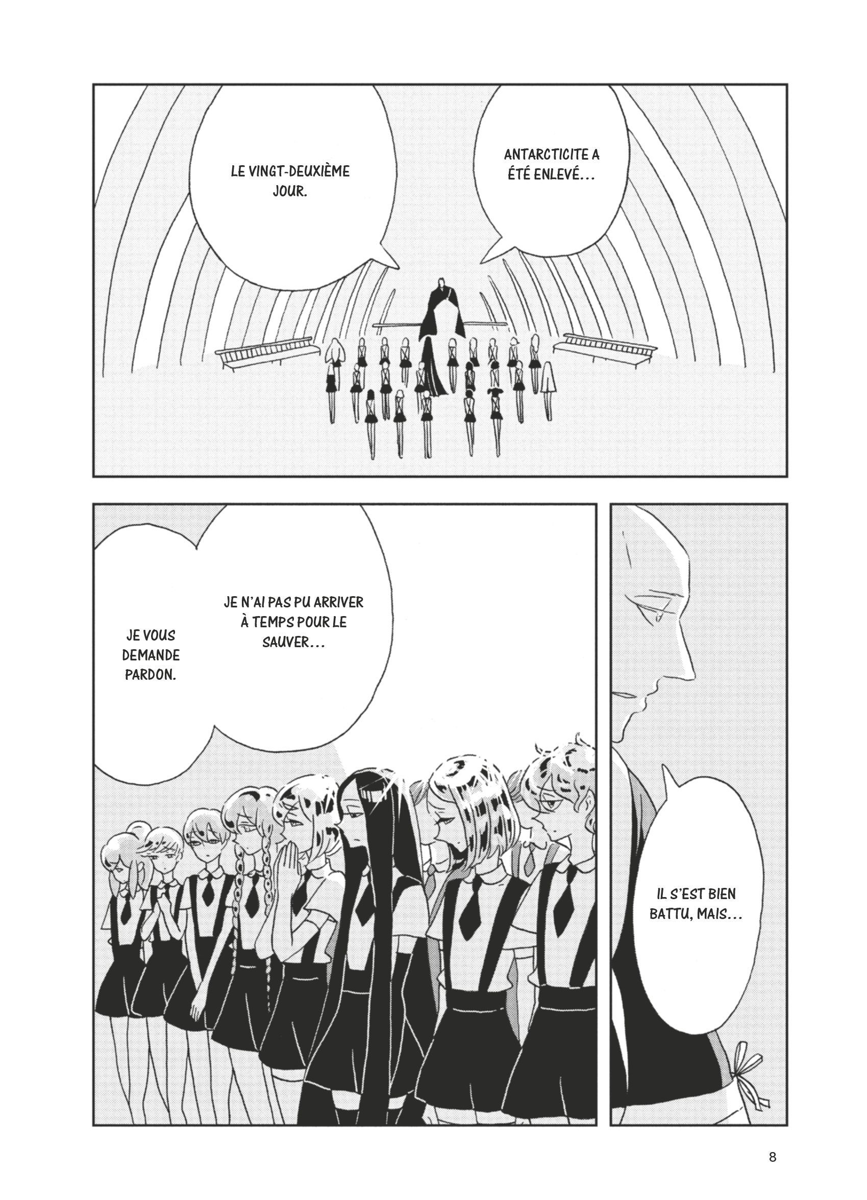 Dans un avenir lointain, la bataille entre les cristaux au corps immortel et les Séléniens se poursuit. Après avoir perdu ses bras et en avoir acquis de nouveaux en alliage métallique pendant l’hiver, Phos, le personnage principal, semble cependant avoir perdu tout souvenir de Cinabre…