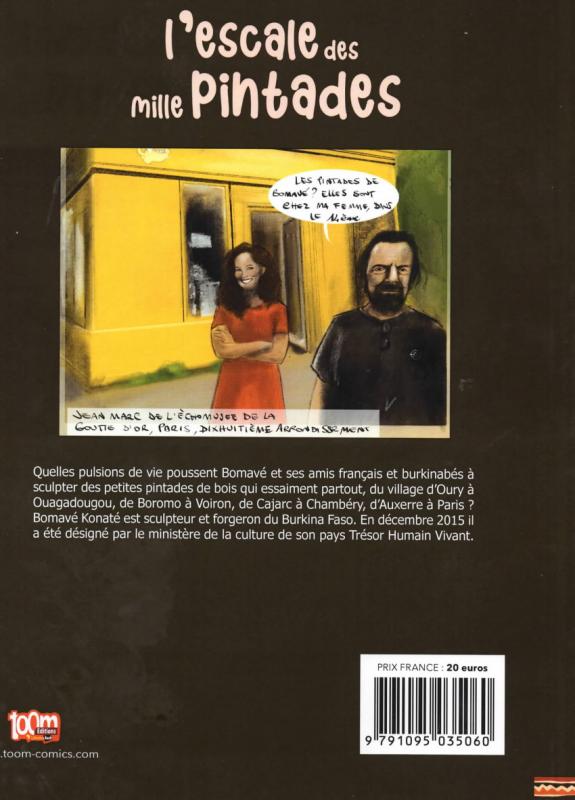 Danièle, François, Régine, Joëlle B., Joëlle G., André, Agnès... Des amis français passionnés par l’Humain et ses Cultures. Comme Bomavé. Prêts, comme lui, à faire un pas de côté pour comprendre et agir avec l’autre, le différent et semblable. La rencontre est si naturelle et profonde entre le clan français et le clan Konaté qu’elle représente une forme de Françafrique idéale, dont la bande dessinée veut témoigner. En illustrant leurs réalisations ou leurs rêves. Cette rencontre féconde existe depuis une trentaine d’années. Nous avons choisi pour en parler un point de convergence : la fabrication de petites pintades en bois de fromager, sachant que la pintade est l’Oiseau Nègre, chargé de symboles et chargé d’histoire, depuis les Romains jusqu’à la colonisation en passant par l’esclavage en Amérique. L’idée de base vient de Danièle, de Voiron. Bomavé l’a fait sienne à Boromo. Et depuis cinq ans les amis de Bomavé diffusent les petites pintades de bois, qui ont beaucoup de succès, notamme