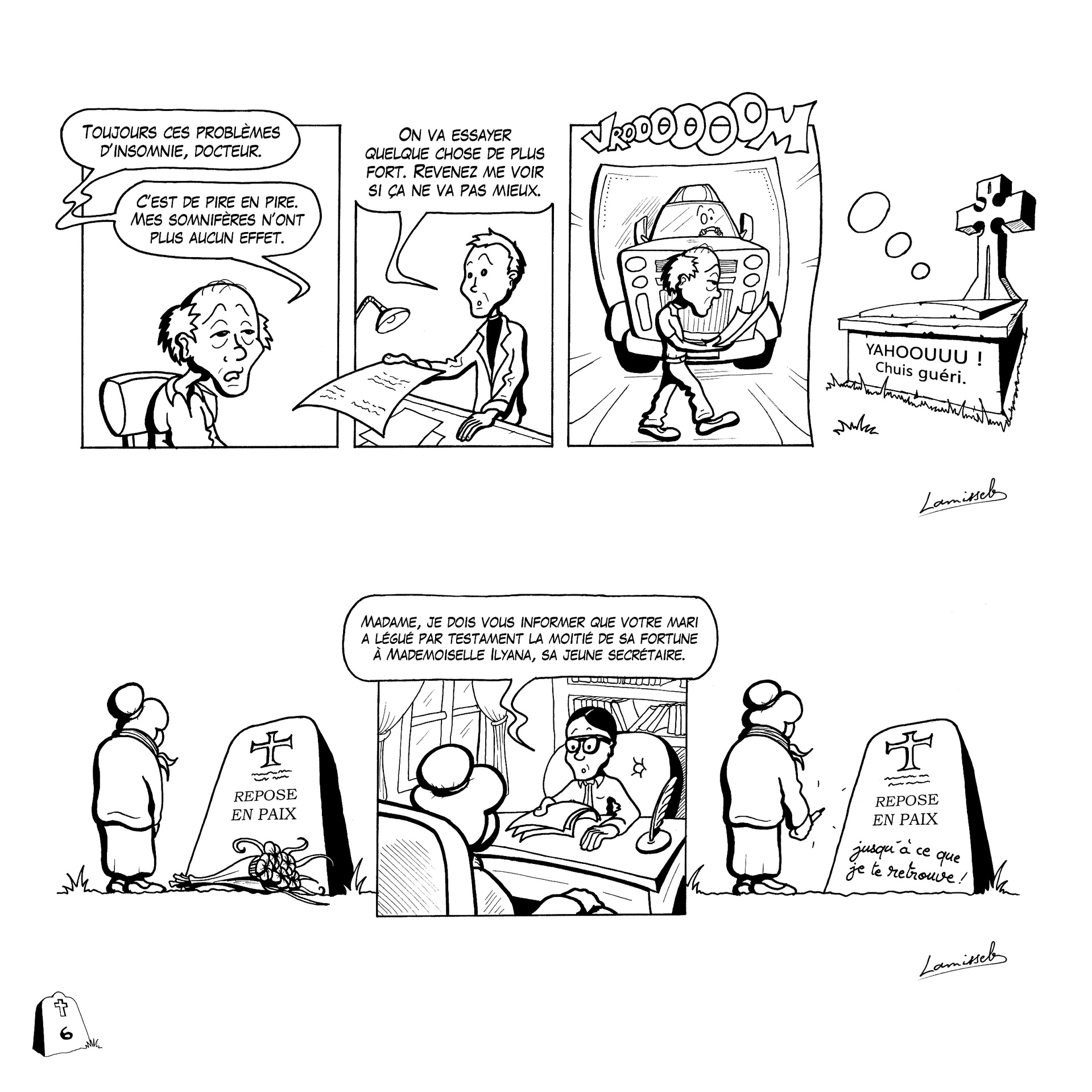 Sous leurs airs lugubres, les cimetières regorgent d’occasions de sourire. On les dit peuplés de personnes indispensables. " Pas seulement ! " répondrait Charles Darwin. On y trouve également les malheureuses victimes d’une sélection naturelle tantôt bêtement hasardeuse tantôt cruelle, tandis que d’autres ne doivent leur trépas qu’à une stupidité sans limite. " Et Pis Taf ! ", c’est une BD qui commence toujours par la fin. Celle de ces pauvres gens, presque tous fictifs, qui nous ont quitté dans des circonstances dont on a un peu honte de rire. Sans violence ni effusion de sang, assortis d’épitaphes saugrenues, ces accidents et autres disparitions peu glorieuses devraient faire sourire jusqu’aux âmes les plus sensibles.