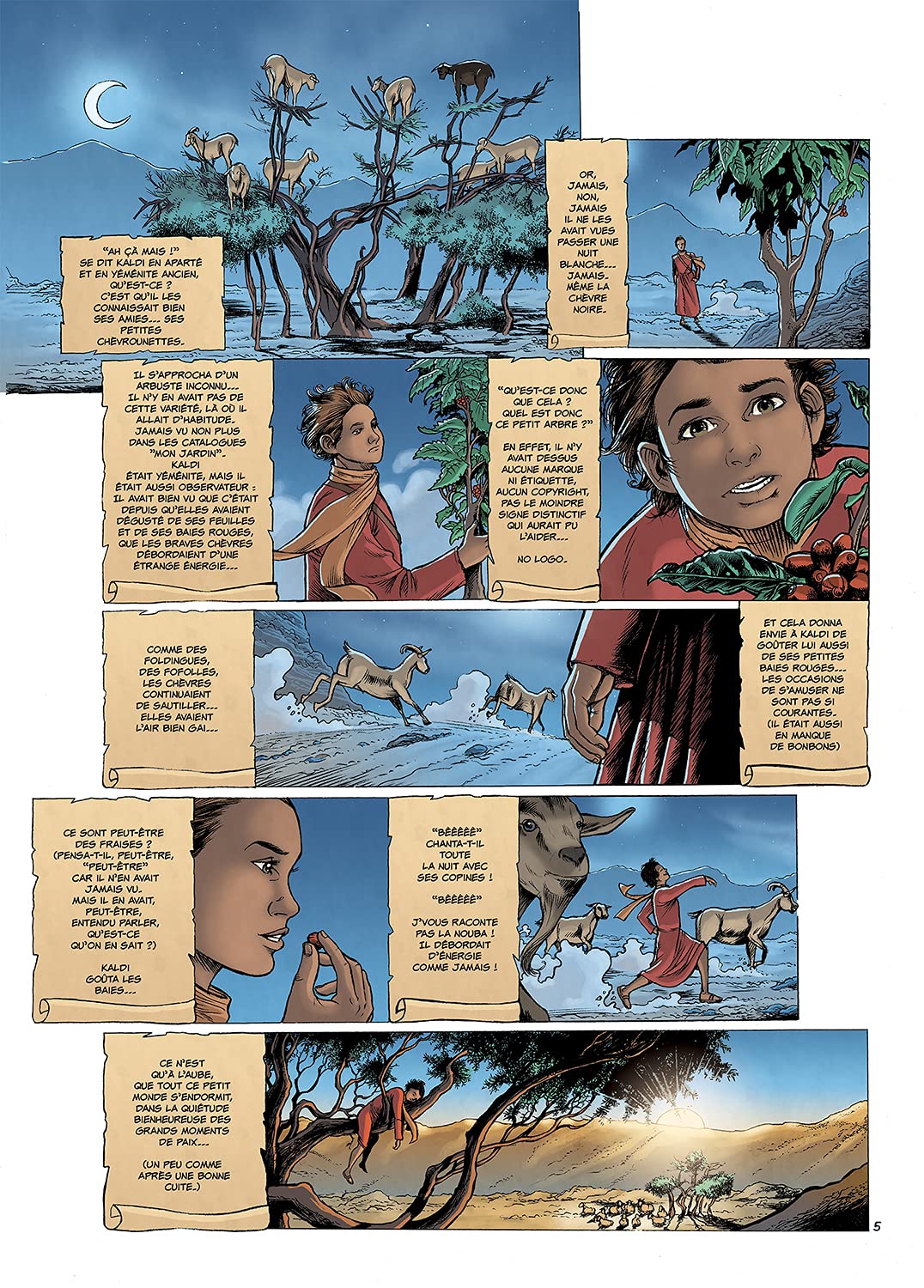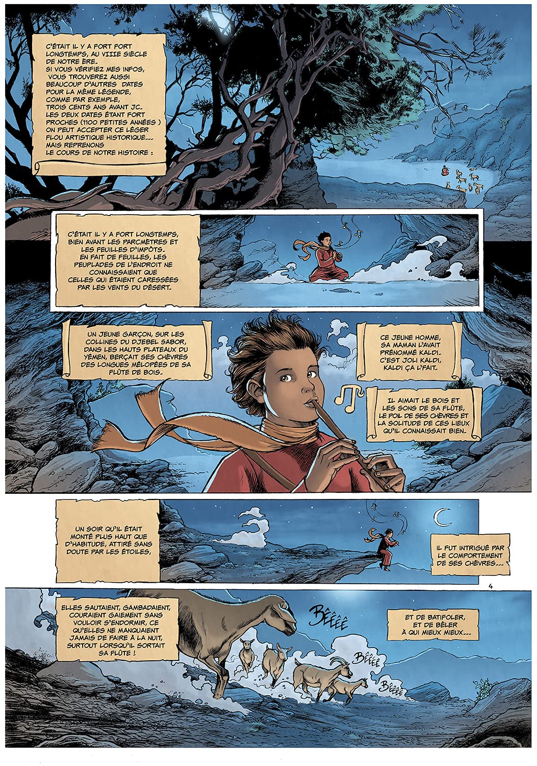 C’était il y a fort longtemps, sur les hauts plateaux du Yémen, dans les collines du djebel Sabor, que le vent caressait doucement. Un jeune garçon veillait sur son troupeau de chèvres, tandis que les longues mélopées de sa flûte survolaient la poussière et poussaient tranquillement le soleil vers le couchant. Tout était si calme, or, le soir venu... C’est ainsi que débute la prodigieuse histoire du café.