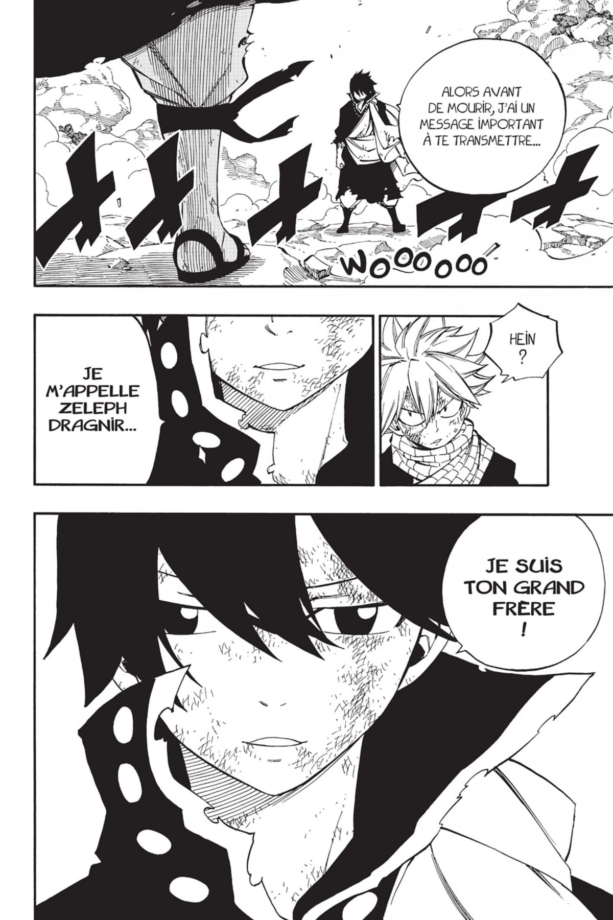 Guidés par le destin, Natsu et Zeleph se livrent une terrible bataille ! La véritable identité de Natsu, un projet de grande envergure, Zeleph multiplie les révélations fracassantes ! Et Natsu qui perd soudainement connaissance... Pendant ce temps, la situation sur les champs de bataille évolue. Au sud, Lamia Scale et Mermaid Heel sont en grandes difficultés, et au nord, Saber Tooth et Blue Pegasus ont été contraintes de reculer face à un ennemi trop puissant. Enfin, à l’est, les Mages Sacrés ont pris part au combat, mais "l’Ange de la destruction" est lui aussi sorti de sa tanière !