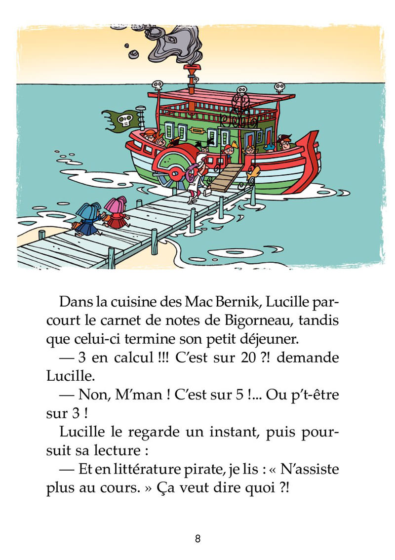 La Famille Pirate débarque en roman jeunesse ! En fin d’année, Mlle Lanchois, la maîtresse d’École Pirate annonce que tous les élèves doivent passer un stage pratique en piraterie. C’est la règle. À la suite d’un tirage au sort malheureux, Bigorneau passe son stage chez Irvin. Si Bigorneau n’est pas doué pour la théorie, il s’avère être par contre dans la pratique, une redoutable graine de Pirate. Avec la Famille Pirate, plongez dans le monde des flibustiers, fait d’aventures, d’action. et de rigolade.