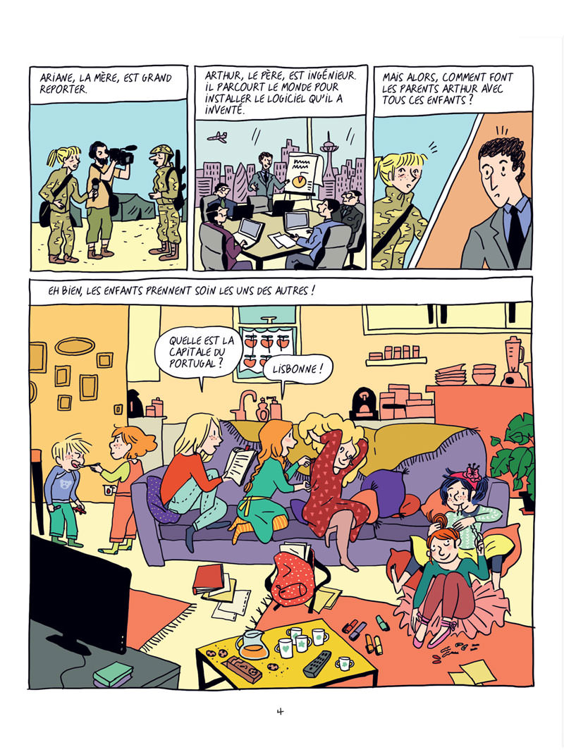 La famille Arthur n’est pas tout à fait comme les autres. Déjà, il y a 6 filles : Anna, Cara, Bella, Dana, Flavia et Elisa. Vous les avez tous ? Et un garçon, Gabriel, le petit dernier. Ariane, la maman, est grand reporter, Arthur, le papa est ingénieur et parcourt le monde pour installer un logiciel révolutionnaire. Autant vous dire que ces deux-là ne sont pas souvent à la maison.